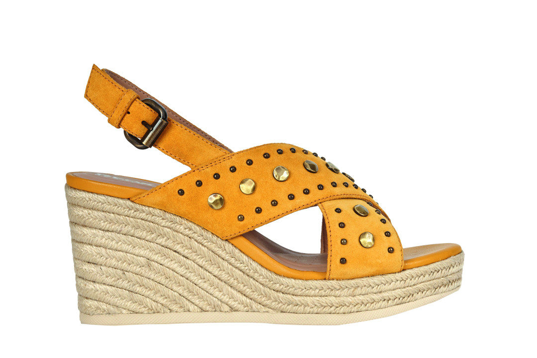 Мягкая замша актуального оттенка охры с перфорацией и металлическими заклепками плюс джутовая танкетка — вот вам и лучшая пара лета от Geox.