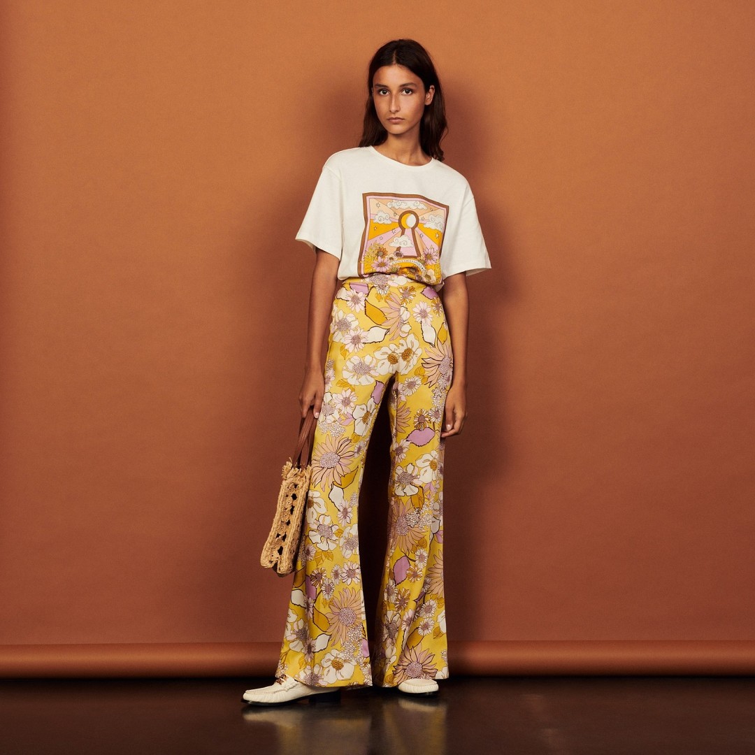 Для Sandro наступила пора цветения. Именно сейчас — под летним солнцем — на брюках, платьях, блузах и юбках зацвели экзотические растения всех видов и форм. Тут и городские варианты, и флора джунглей на радость всем любителям ботаники. Вот так коллекция ловко объединила главные принты 70-ых и знаковые визуальные коды бренда.