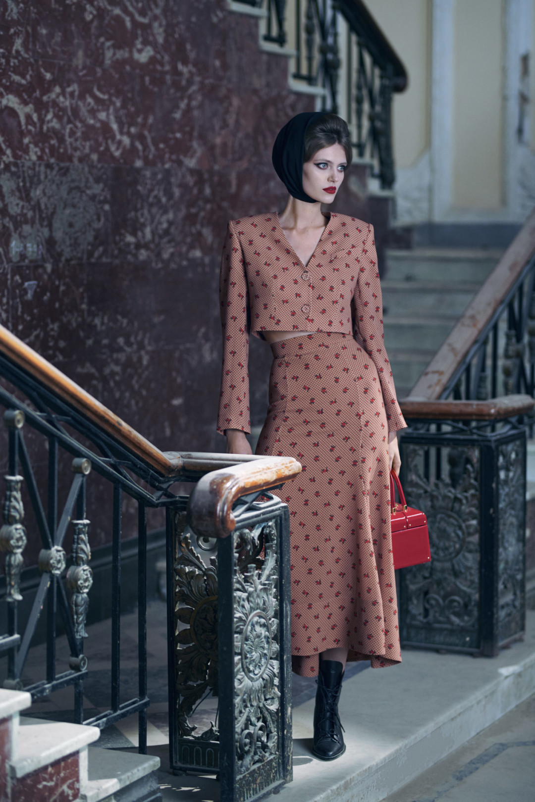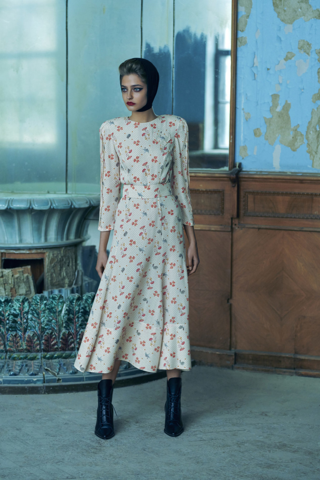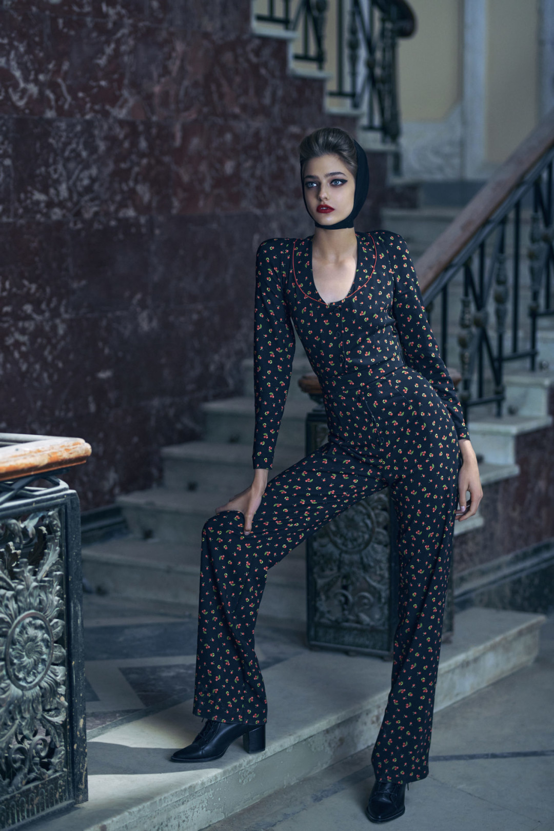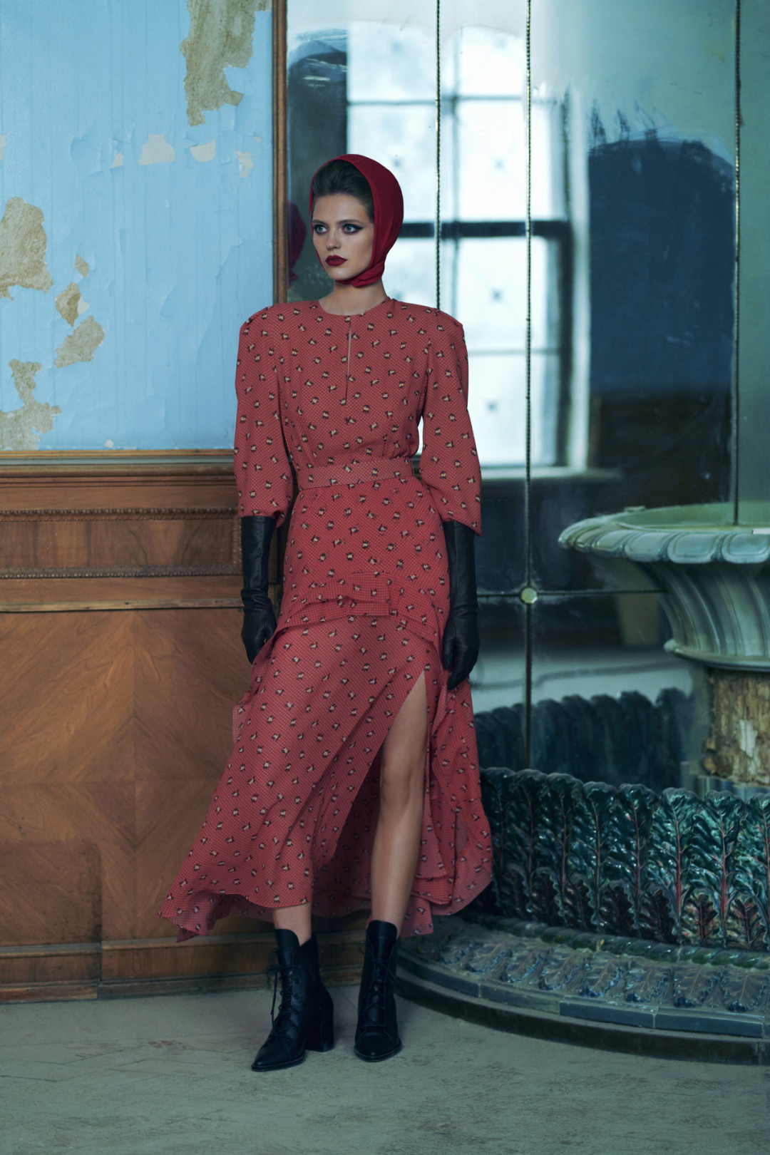 В коллекцию вошли мини и миди-платья, топы (в том числе из кожи) с небольшой баской, жакеты с объемными плечами, комбинезоны, пальто. Каждый образ дополнила шелковая косынка и ботильоны с острым носом.