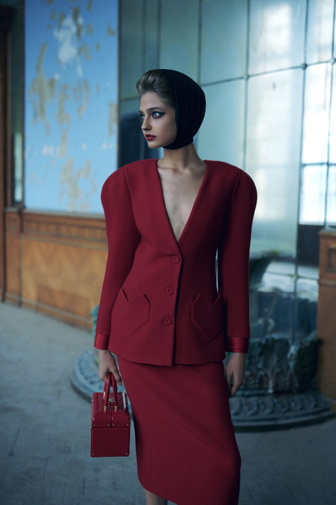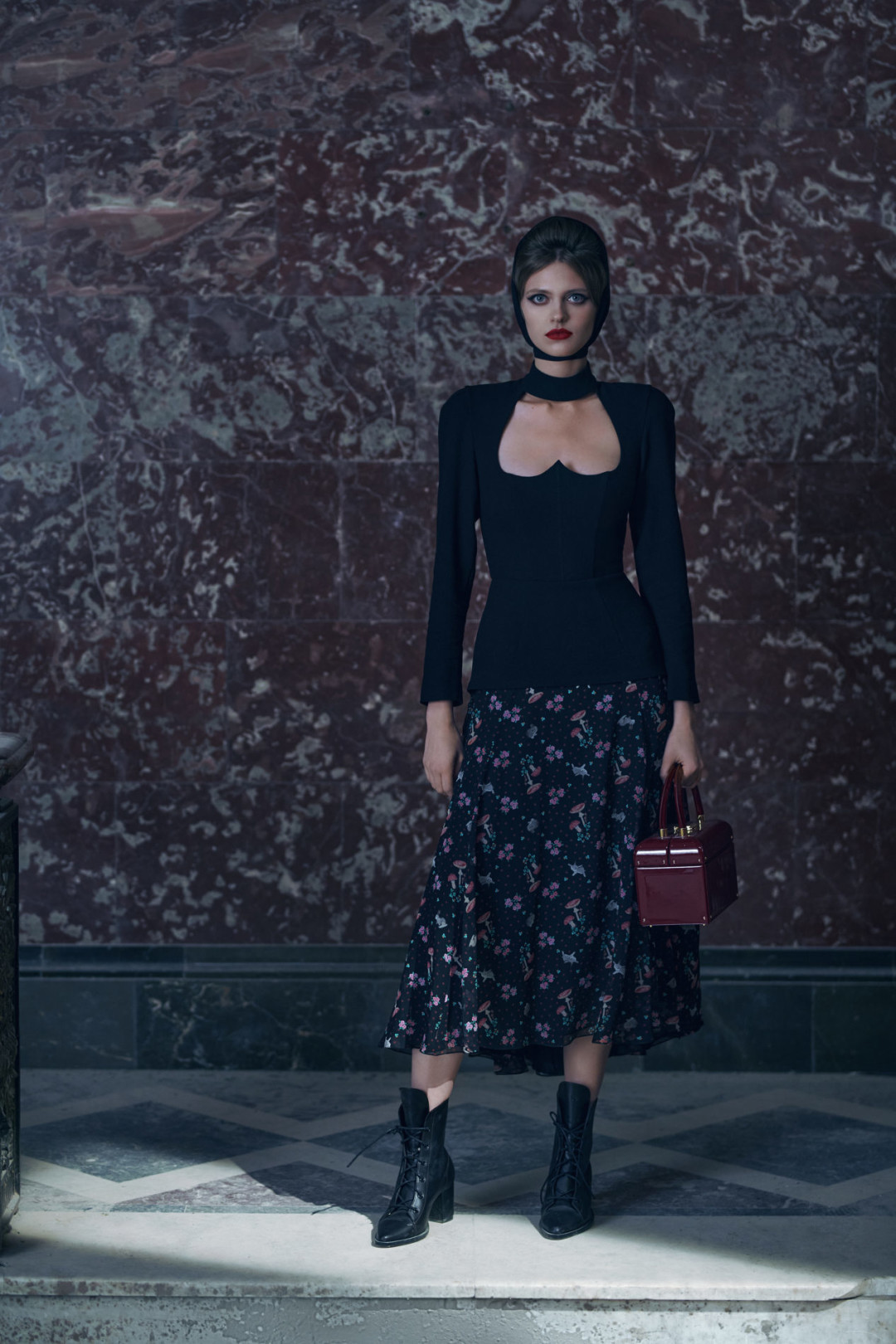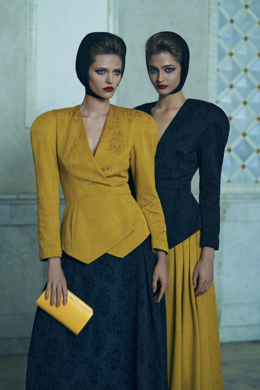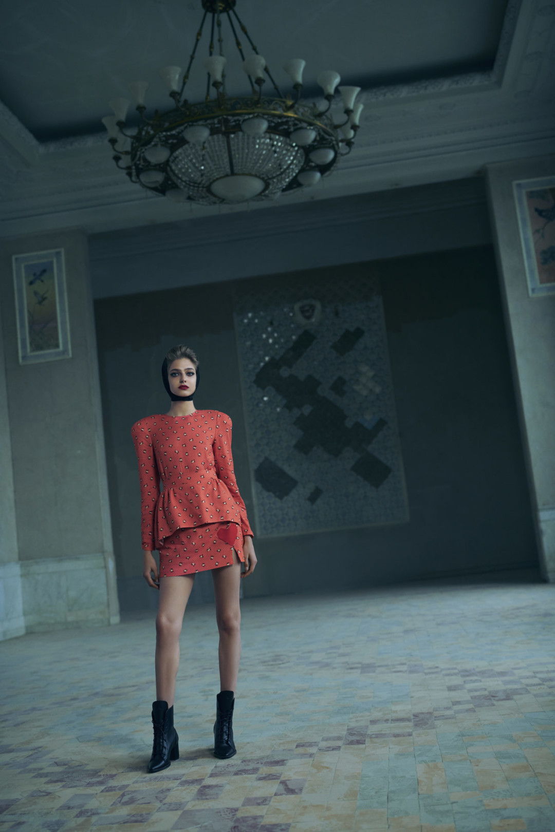 В коллекцию вошли мини и миди-платья, топы (в том числе из кожи) с небольшой баской, жакеты с объемными плечами, комбинезоны, пальто. Каждый образ дополнила шелковая косынка и ботильоны с острым носом.