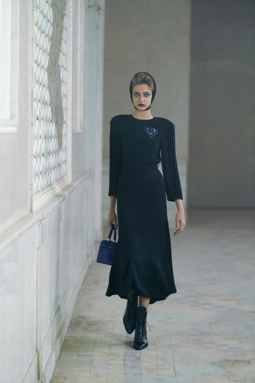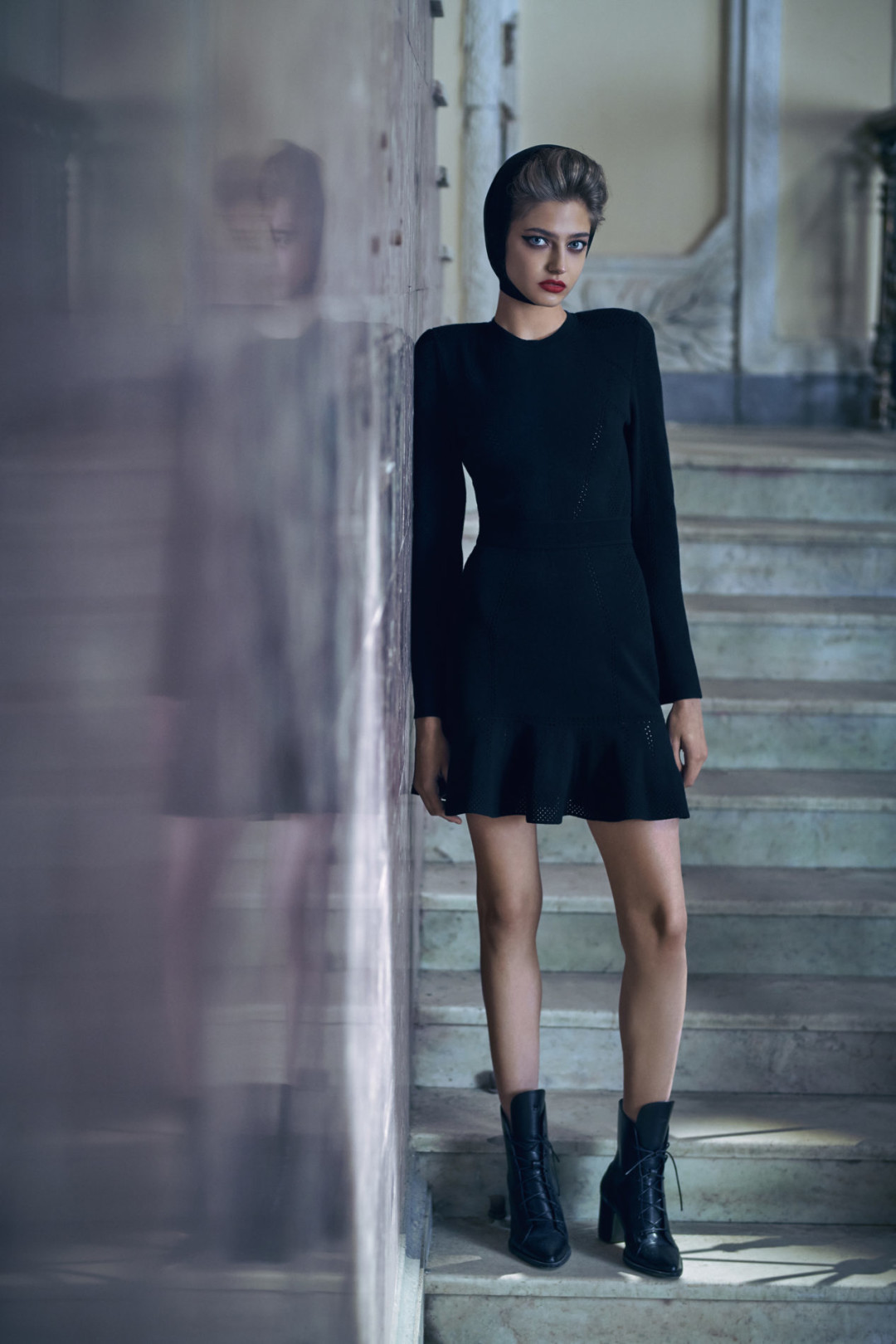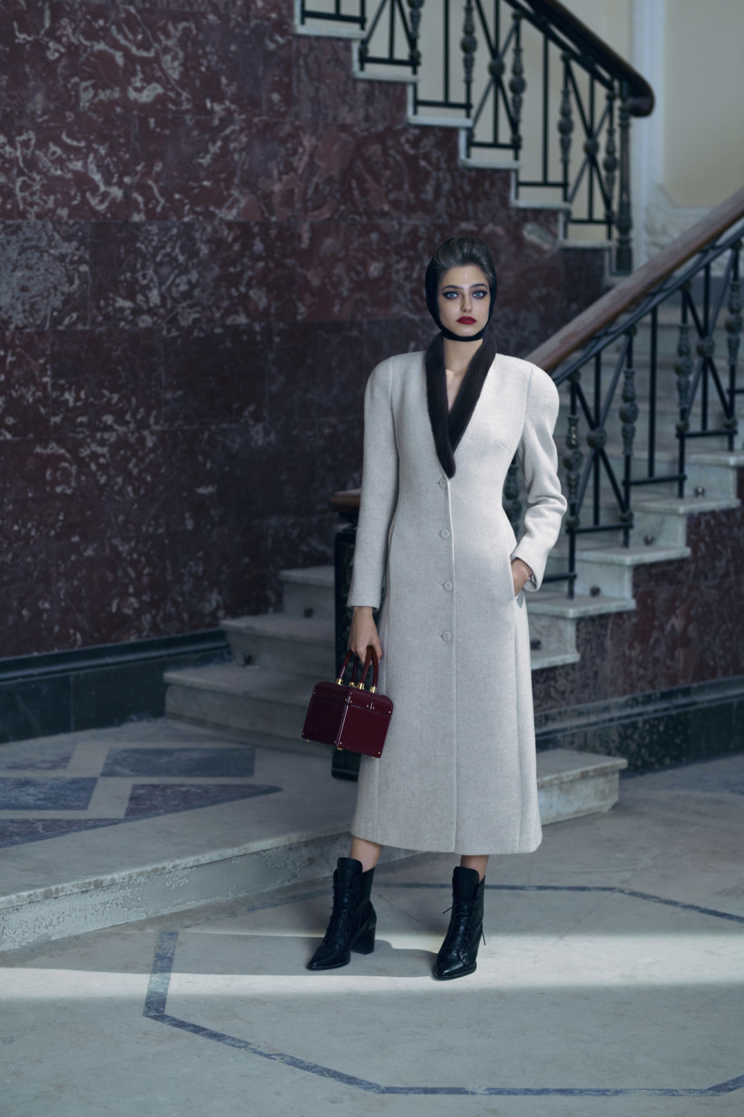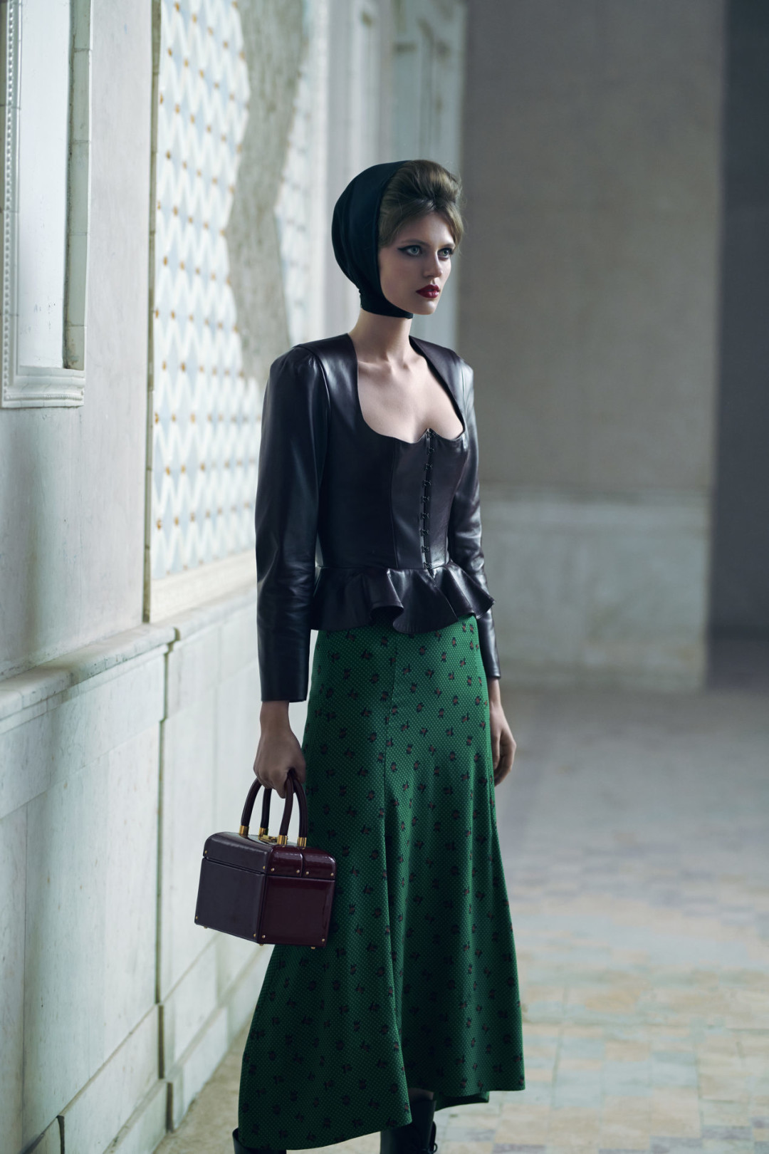 В коллекцию вошли мини и миди-платья, топы (в том числе из кожи) с небольшой баской, жакеты с объемными плечами, комбинезоны, пальто. Каждый образ дополнила шелковая косынка и ботильоны с острым носом.
