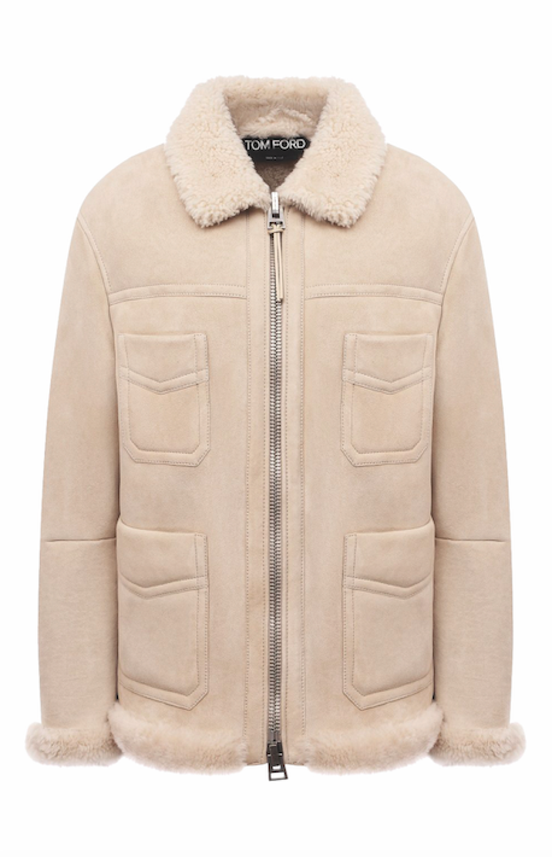 Том Форд придумал дубленку-гибрид: он взял за основу куртку-пилот и вместо грубой кожи повторил все ее детали, включая отложной воротник и накладные карманы, в нежной овчине оттенка слоновой кости.