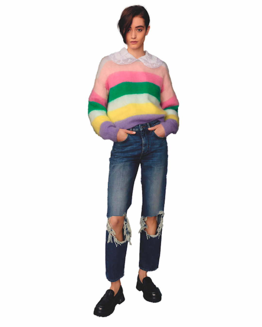 Вещь января — пушистый мохеровый свитер. Идеальный у Maje: не только оптимистично-полосатый, но еще и с трогательным отложным воротничком. Такую нежнятину носим по панку: с рваными джинсами или легинсами из экокожи.