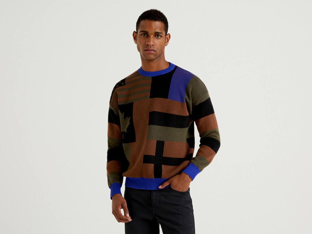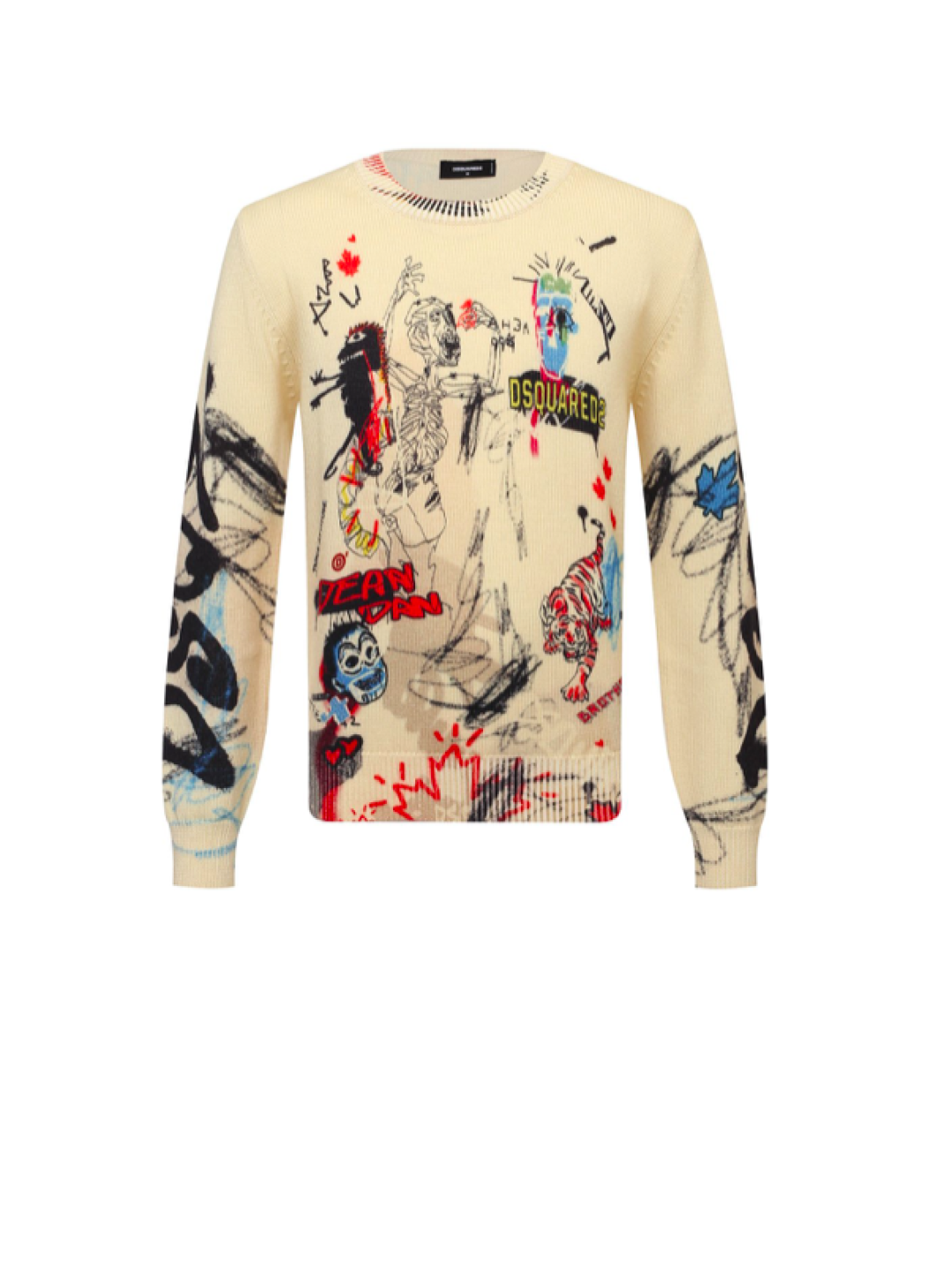 Надписи, примеры стрит-арта, работы современных художников, геометрические узоры и полоска — над мужскими свитерами дизайнеры поработали не хуже.