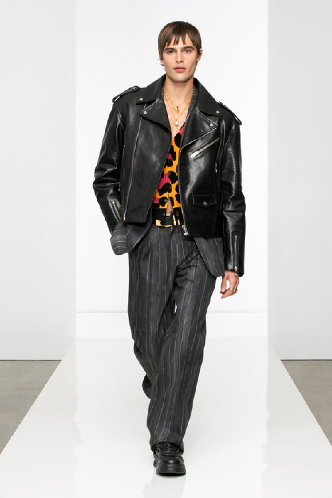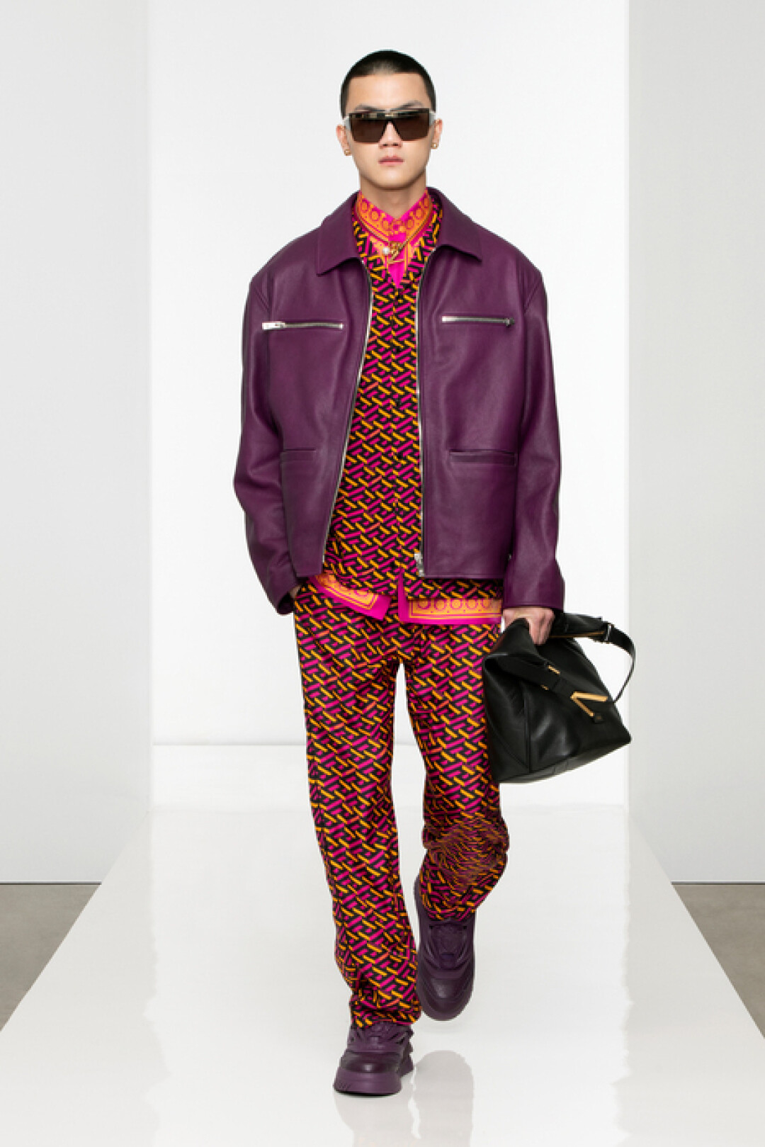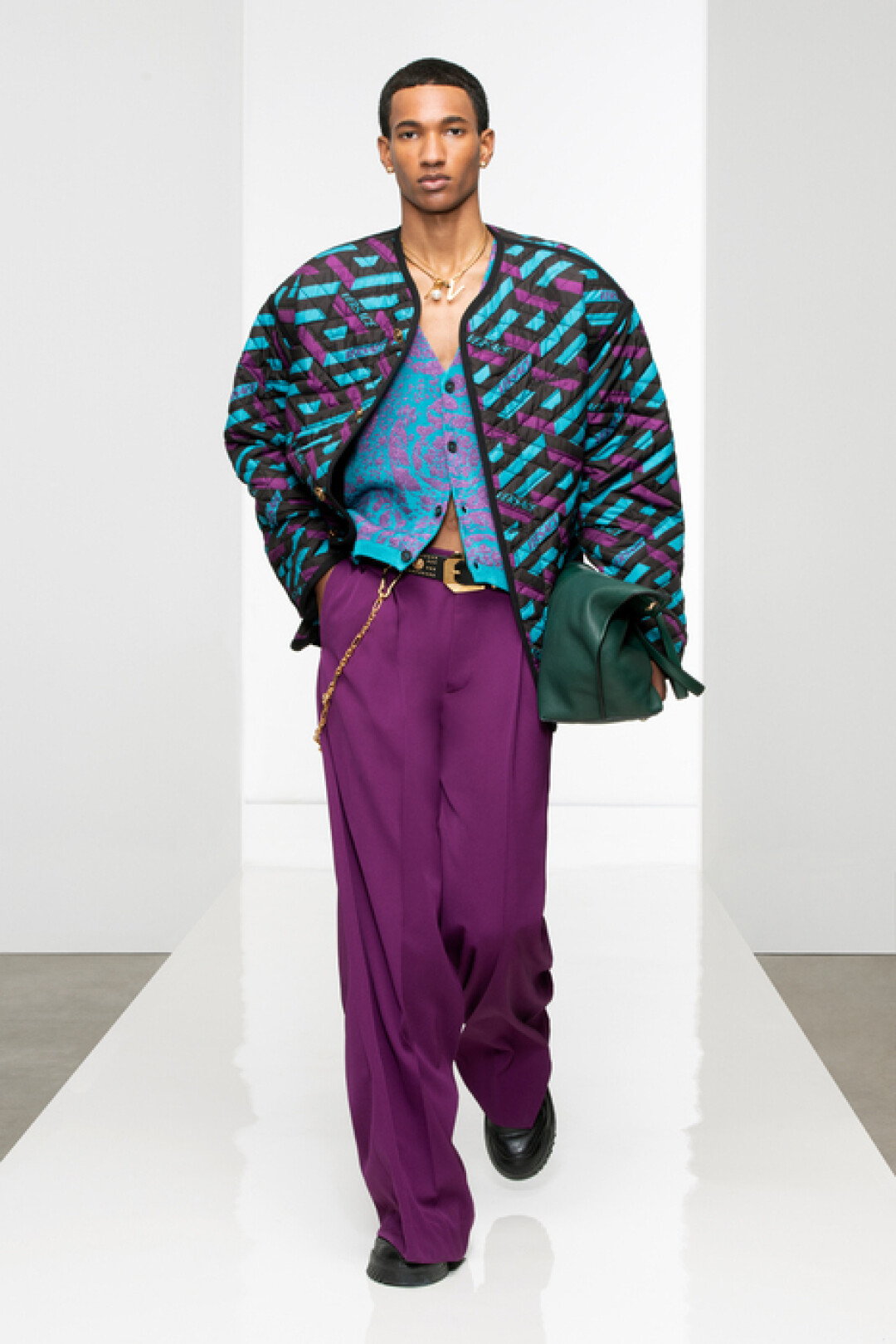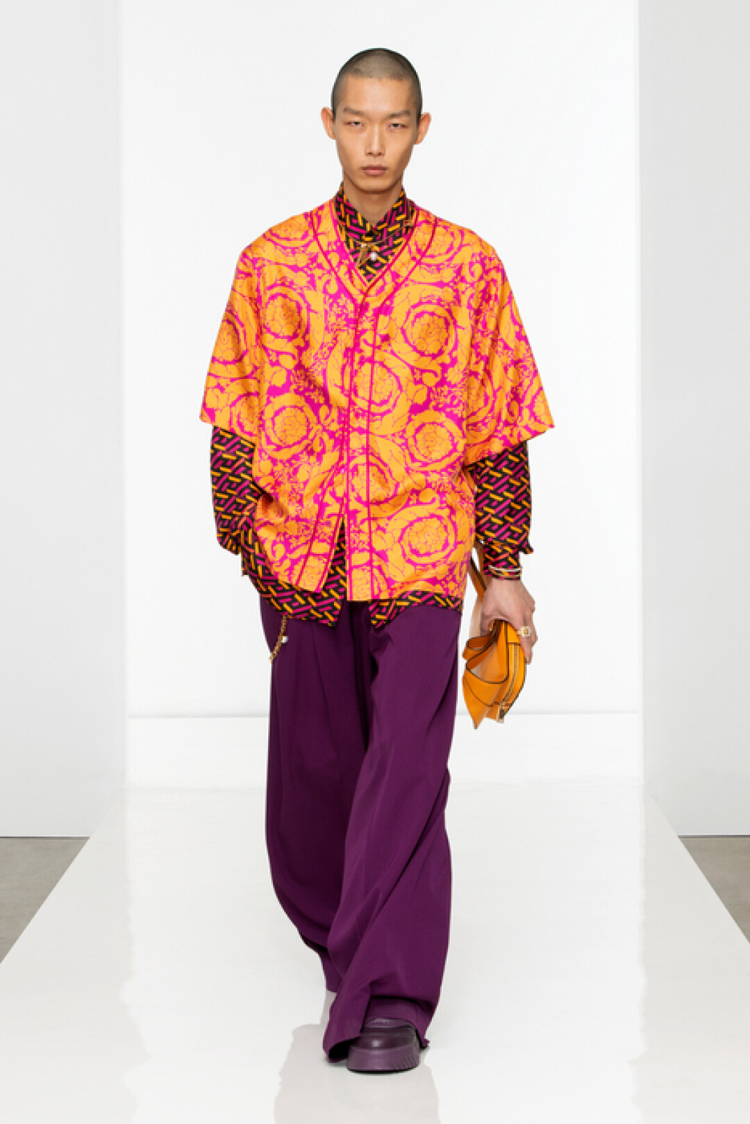 Коллекция Versace воплощает современную роскошь с четкими формами и плавными линиями. В нее вошли кардиганы, мягкие свитеры, свободные брюки, атласные тренчи, классические костюмы, куртки и бомберы, которые можно (и нужно!) носить поверх пиджаков. Среди принтов — архивный узор модного дома La Greca и анималистичный, а в цветовой палитре главенствуют чистые и яркие оранжевый, бирюзовый, фиолетовый.
