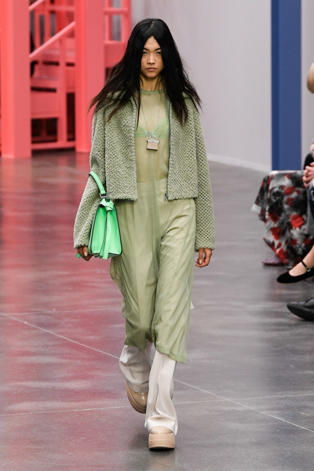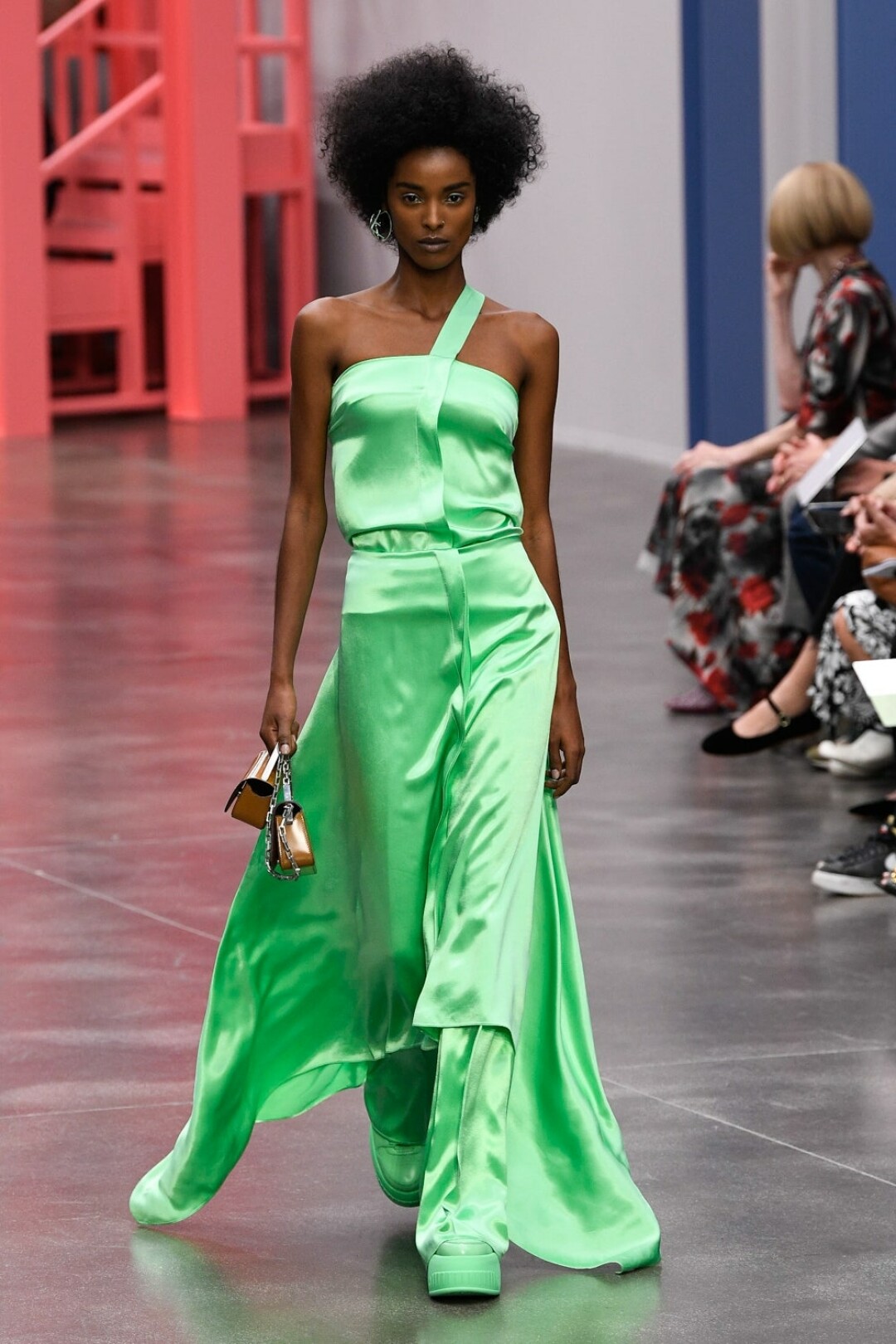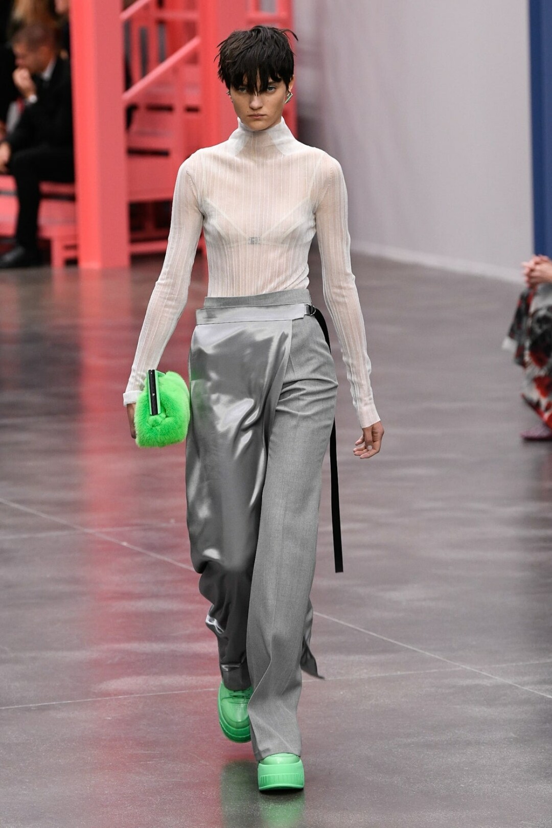 Зеленый цвет у Кима Джонса выглядит и правда отлично: струится шелком и сияет акцентной обувью. Все бы ничего, но за последние пару сезонов мы от него порядком устали и хотим уже наконец разглядеть чуть больше новых оттенков. Еще один провал — брюки карго с лого на карманах: нет никакого шанса, что они гармонично приживутся в гардеробе даже самых отчаянных любительниц дизайнера.