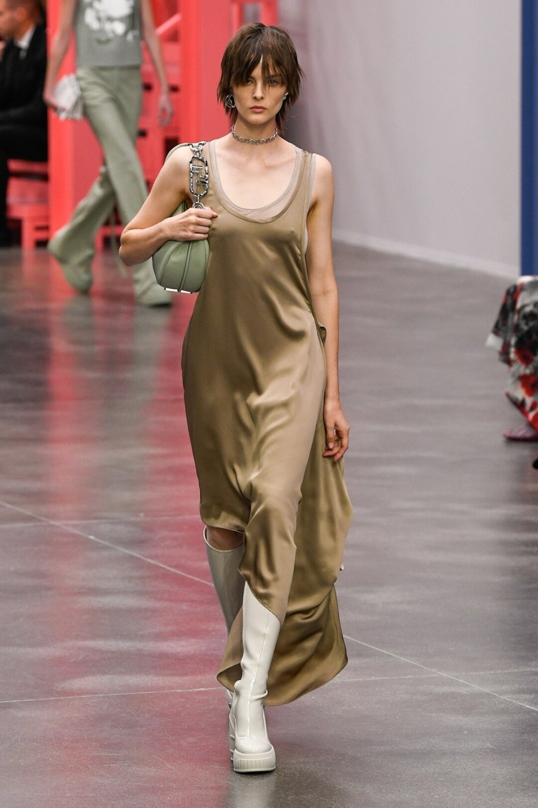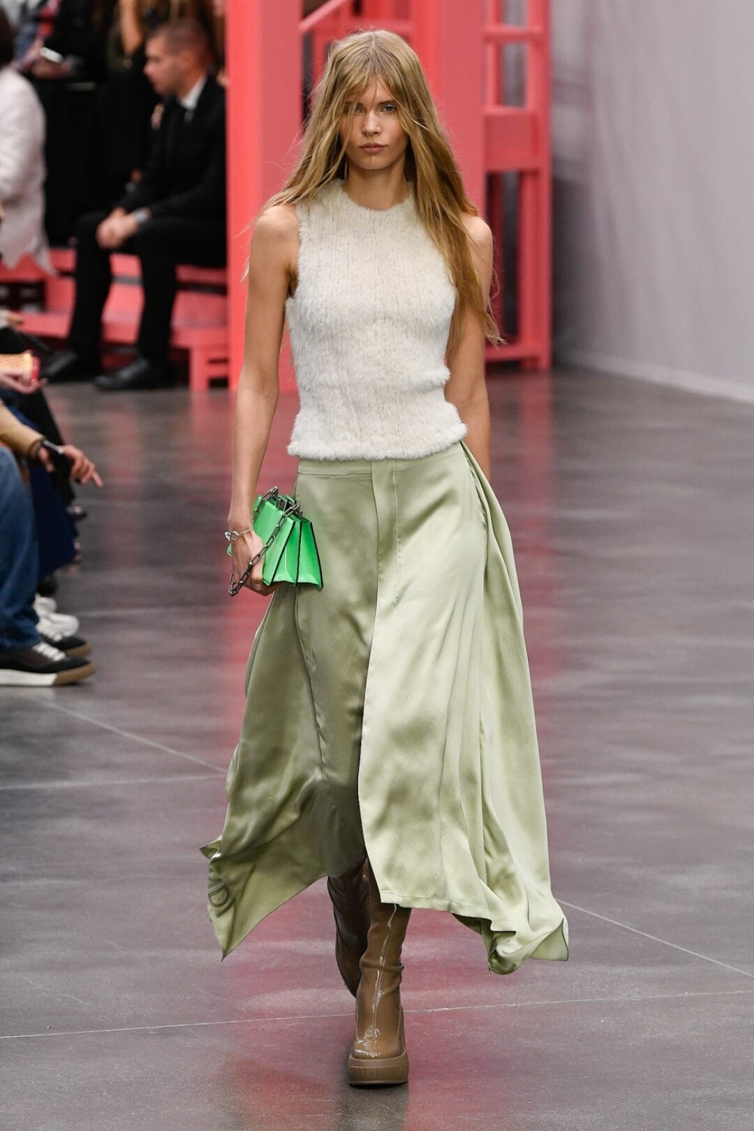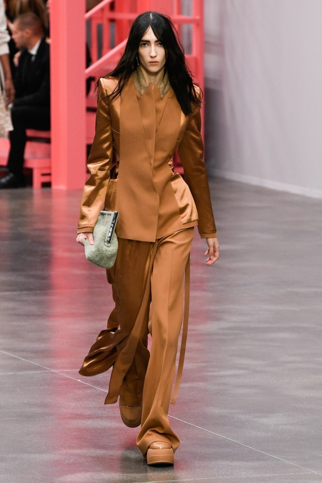 Зеленый цвет у Кима Джонса выглядит и правда отлично: струится шелком и сияет акцентной обувью. Все бы ничего, но за последние пару сезонов мы от него порядком устали и хотим уже наконец разглядеть чуть больше новых оттенков. Еще один провал — брюки карго с лого на карманах: нет никакого шанса, что они гармонично приживутся в гардеробе даже самых отчаянных любительниц дизайнера.