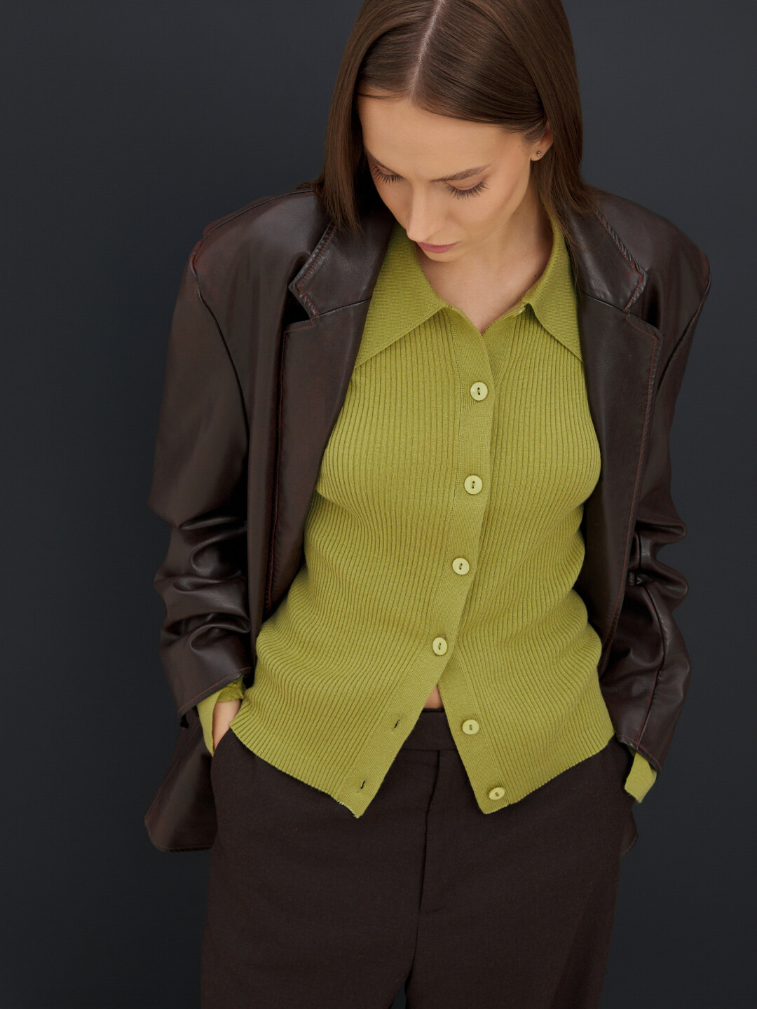 Оттачиваем мастерство колорблока и по цветовому канону Gucci сочетаем шоколадные пиджаки с зелеными кардиганами от французских артизанов Maison David во главе с Давидом Гамазаном (начинали в 2020 году с дропа мужской обуви, а теперь наладили сверхсовременное трикотажное производство!).
