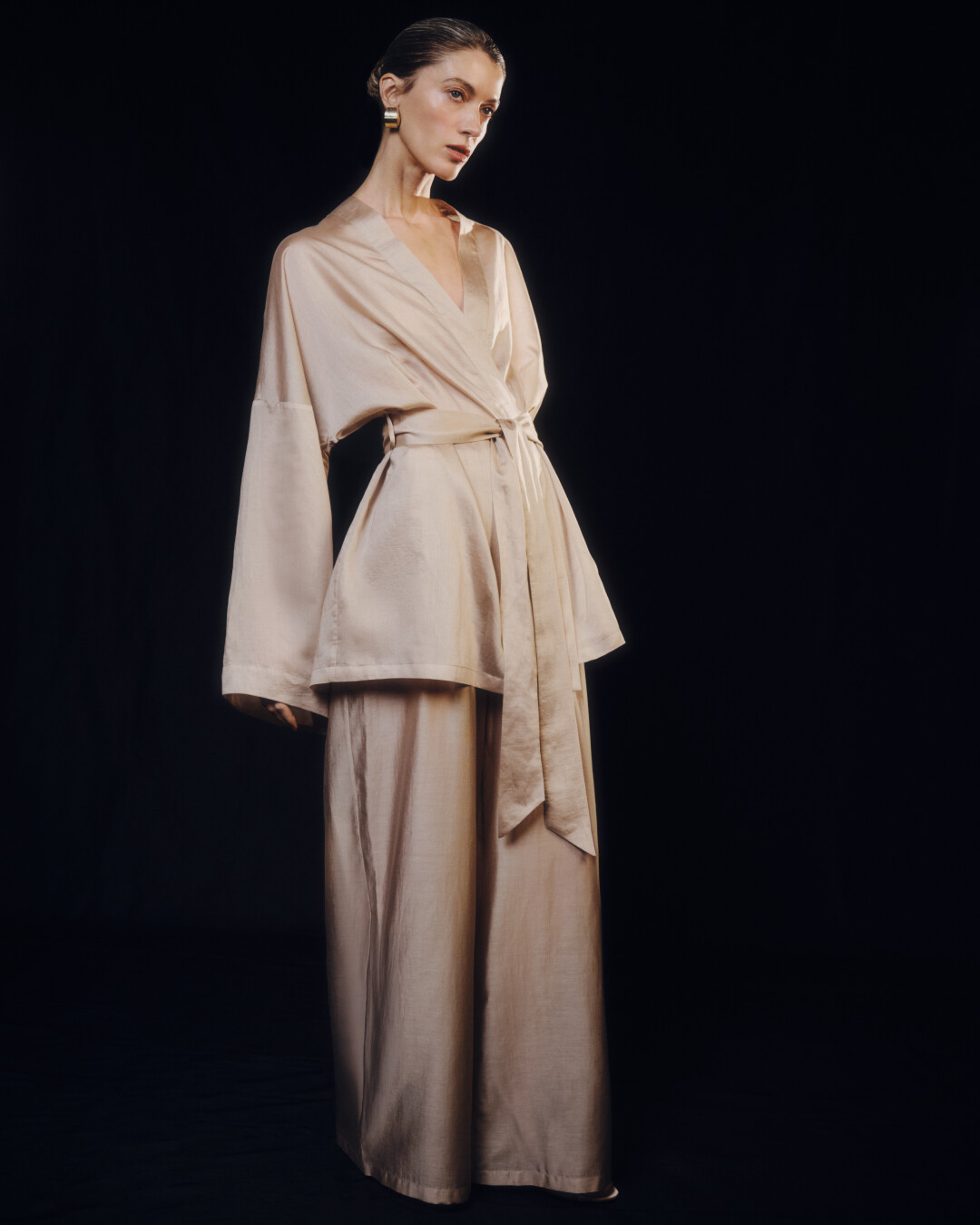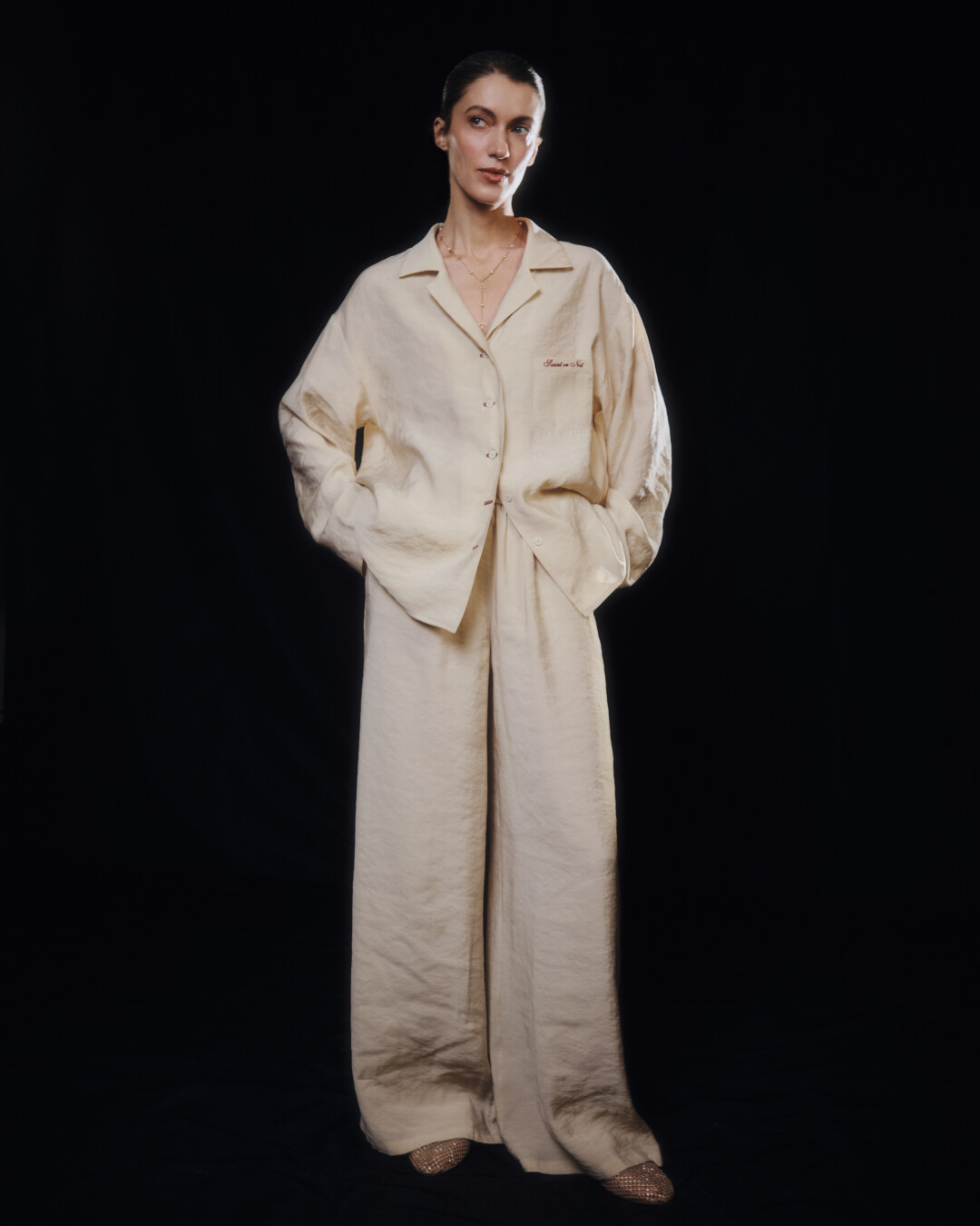 St. Casanier создали лучшую униформу для новогодних праздников (по мнению фэшн-редакторов Собака.ru!) — струящееся кимоно в оттенке шампанского, которое мы готовы снять только ради бежевой двойки с рубашкой и брюками с акцентной бордовой вышивкой «Saint or not» на кармашке. А на волне пижамкора (тренд — вчера, тренд — сегодня, тренд — завтра!) продолжаем носить летом с массивными золотыми браслеми, поясами-цепями и вьетнамками.