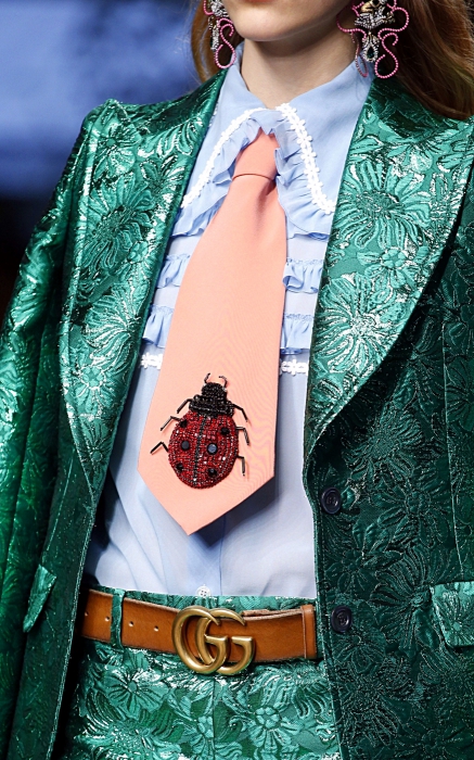 Широкий «депутатский» галстук совершил дауншифтинг: под присмотром Алессандро Микеле обзавелся бисерной божьей коровкой и отправился в «Танцплощадку». (Concept store nevsky 152)