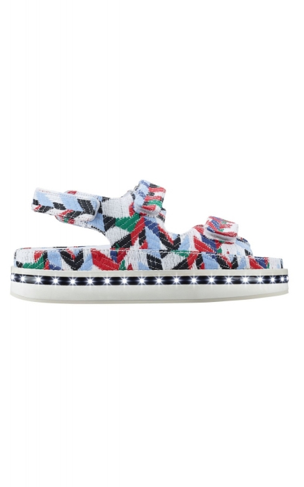 Сандалии Chanel обыгрывают форму суперпопулярных американских шлепанцев на липучке для путешествий Teva, но Лагерфельд не оставляет масс-маркету шанса: детали выполнены из фирменного твида, а вдоль подошвы-танкетки мерцают огни, намекающие на взлетно-посадочные полосы. (Chanel)