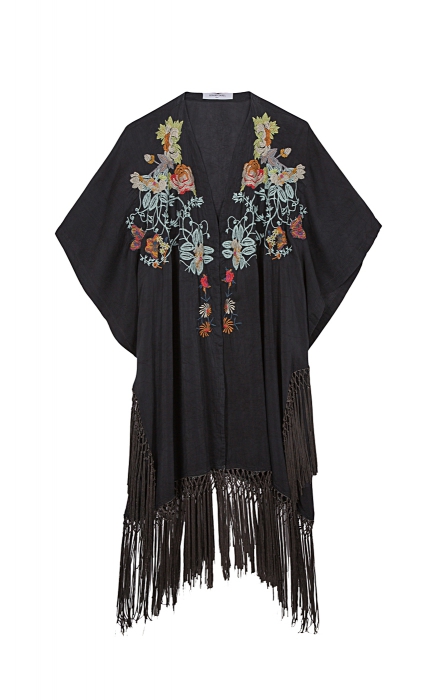 Несмотря на форму традиционного кимоно и ориентальную вышивку, платье-туника Gerard Darel будет уместна даже на рок-фестивале: длинные кисти бахромы превращают его в фетиш хиппи-шика 1970-х. (Gerard Darel)