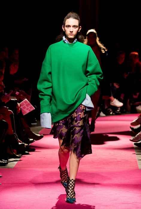 Вариант на холодные дни предложили Kenzo, Alexander Wang и Rag & Bone: все как один миксуют платье-рубашку с брюками, а поверх надевают свитер или свитшот так, чтобы выглядывал второй слой. Это удобный и, главное, теплый вариант, который мы еще вспомним в декабре.