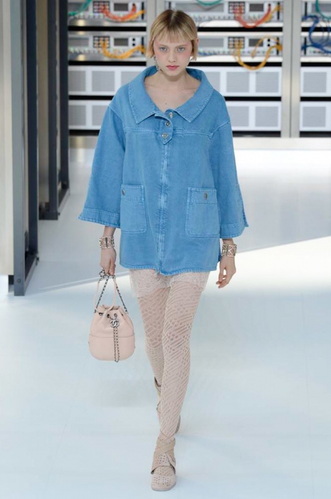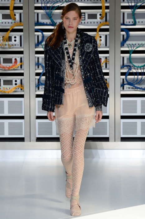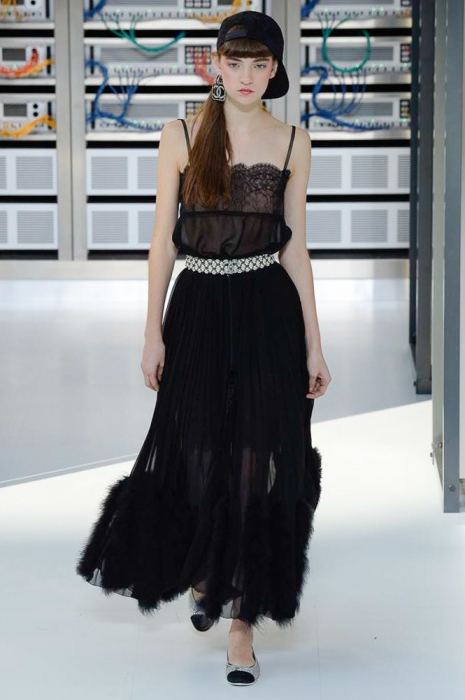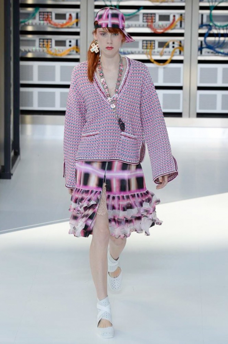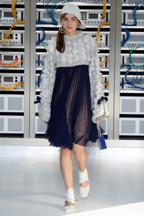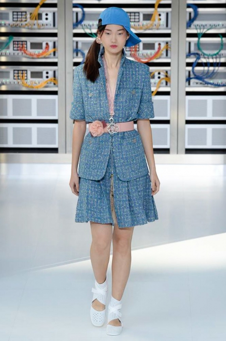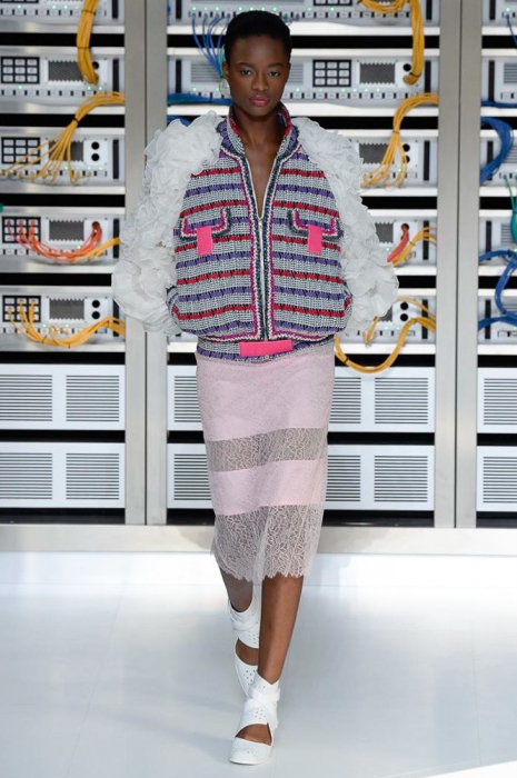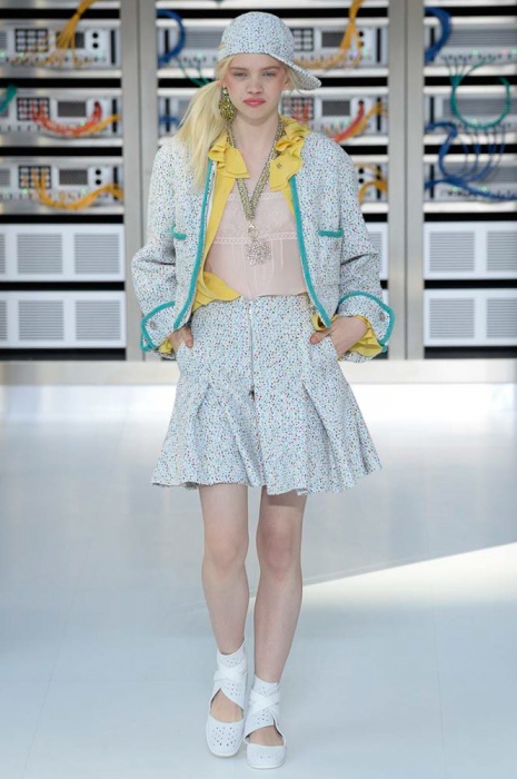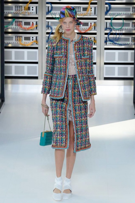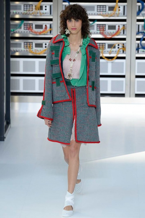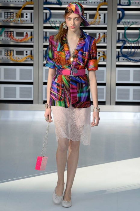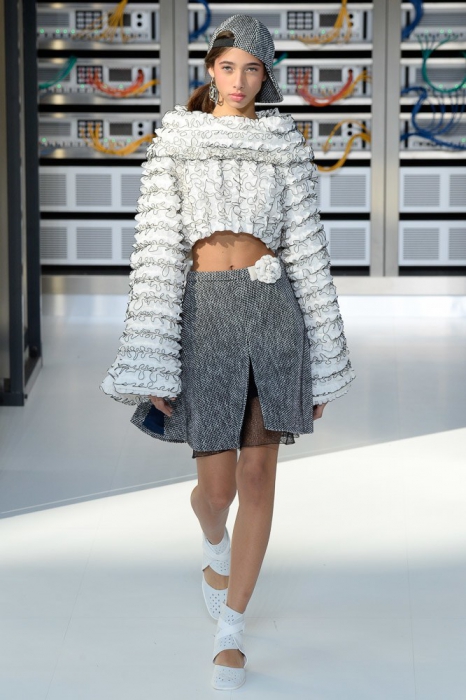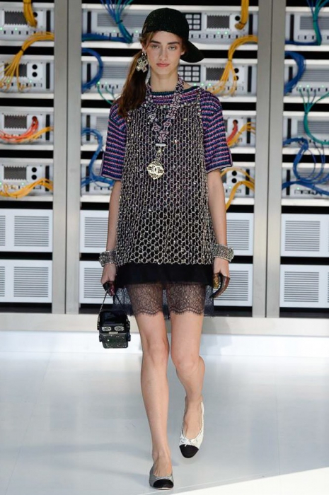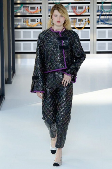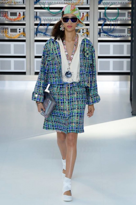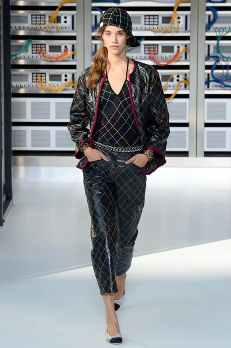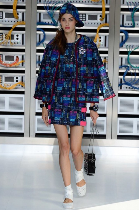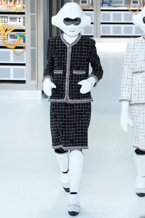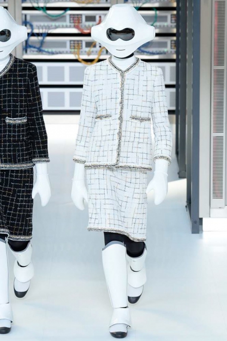 Шоу Chanel прошло в Grand Palais, на этот раз декорированном под гигантский дата-центр — машины будущего, тысячи проводов леденцовых оттенков и белоснежный подиум. It-стилистику принял не только зал для показа, но и сами вещи. Например, шоу открыла модель в маске робота и твидовом костюме, надетом поверх водолазки (привет Стиву Джобсу).