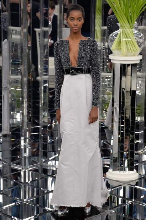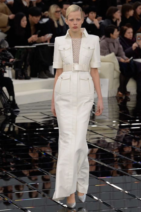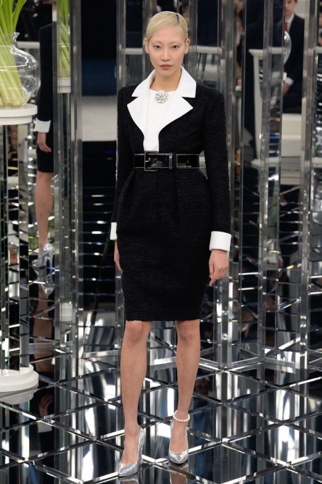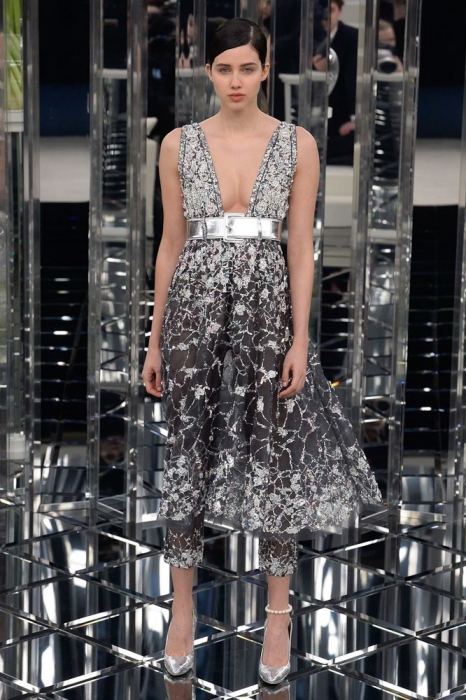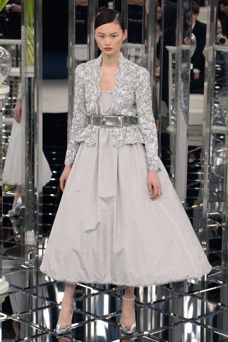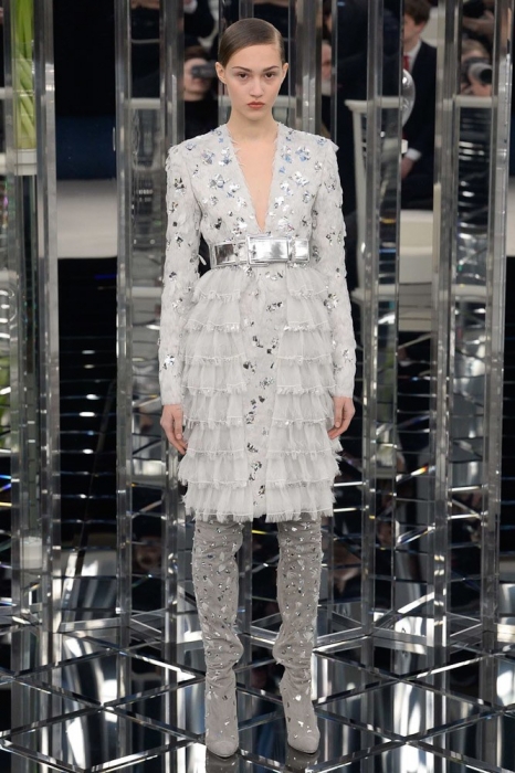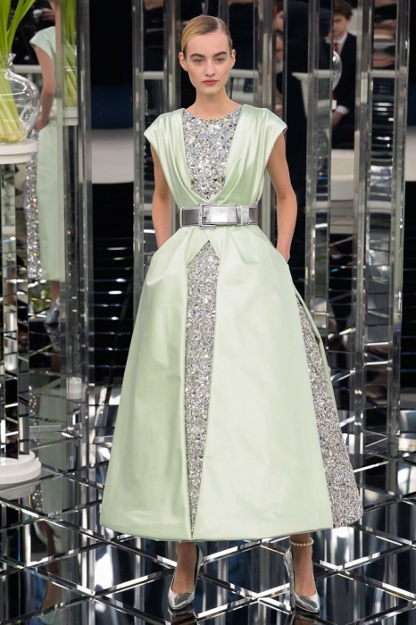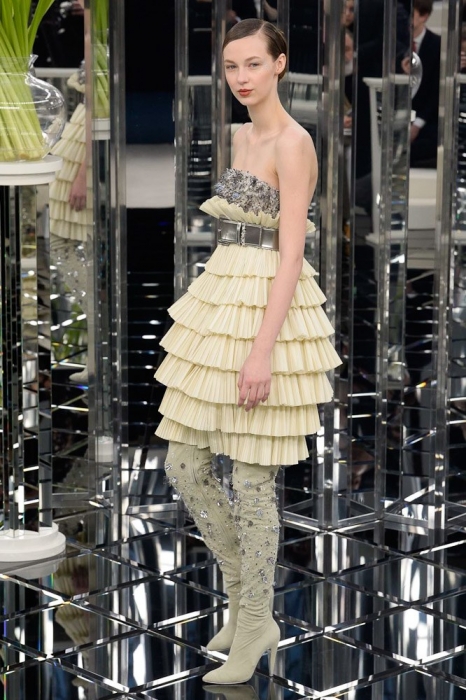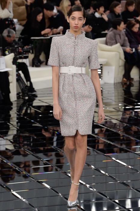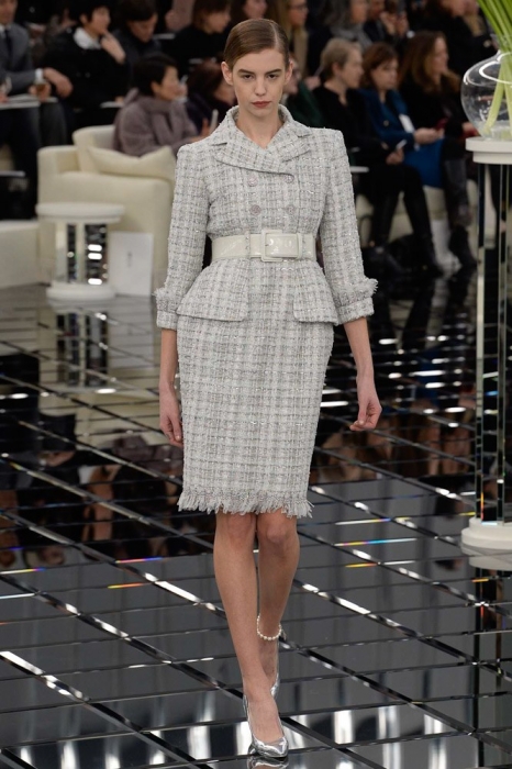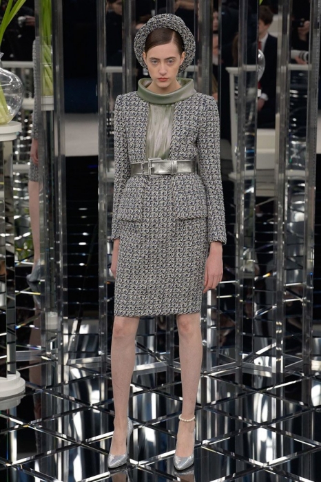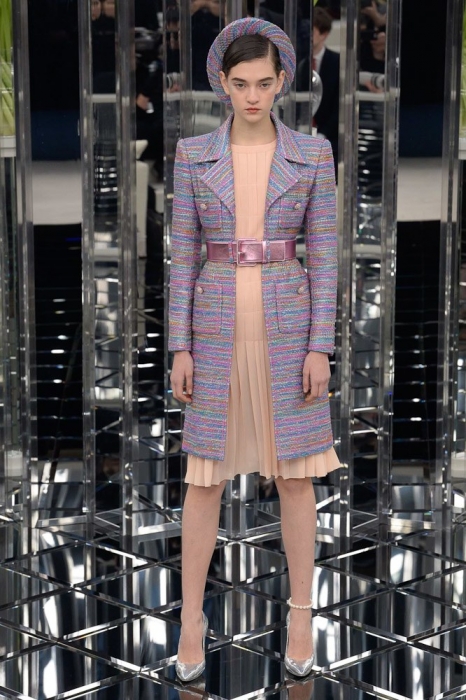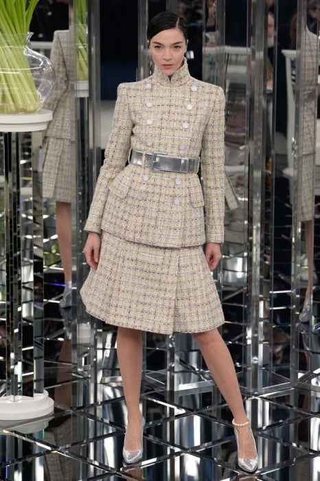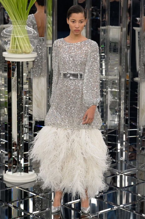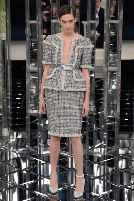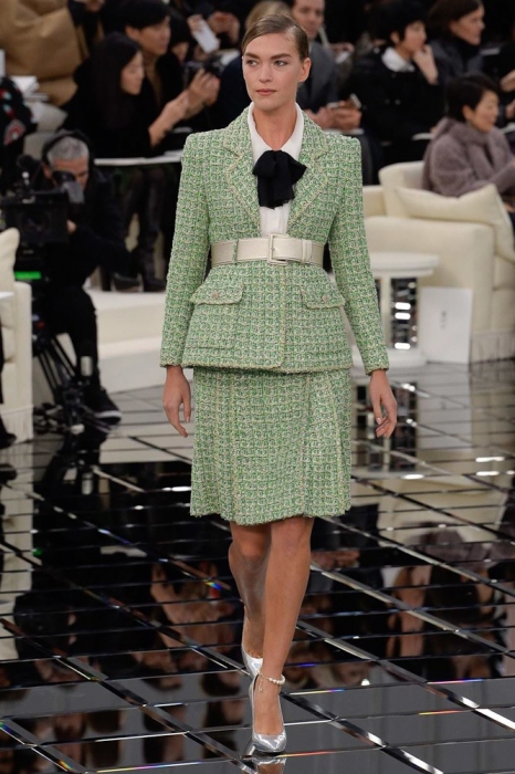 Главным аксессуаром коллекции стал перламутровый ремень: на шоу он присутствовал почти в каждом луке и подпоясывал твидовые жакеты, повседневные комплекты, драпированные платья и вечерние платья с перьями.
