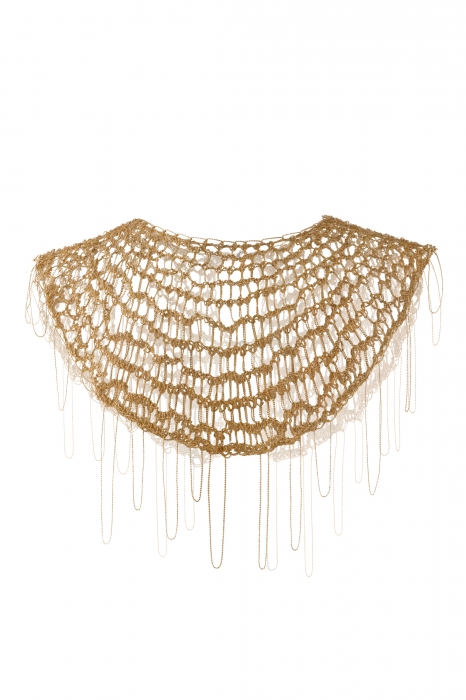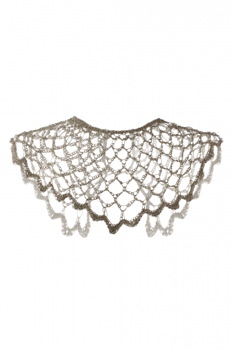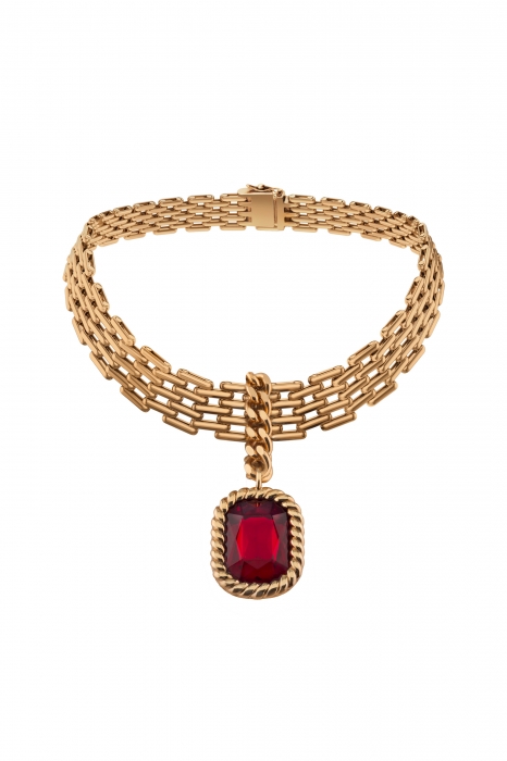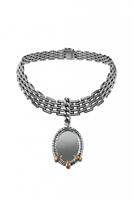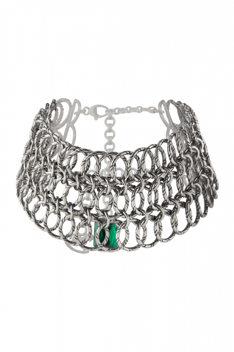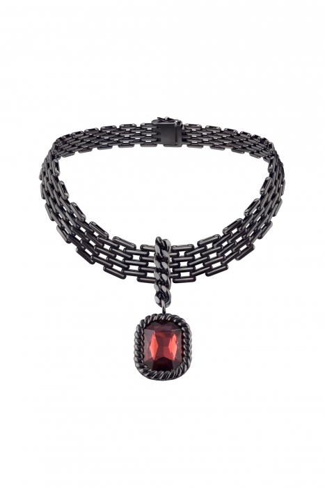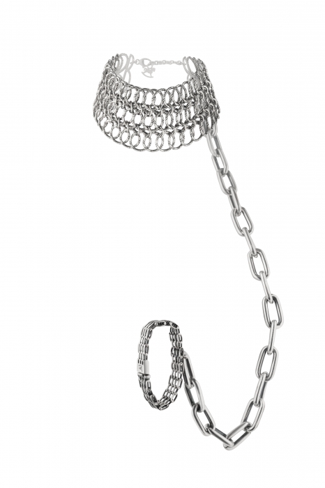 Ожерелья сделаны из бубенчиков, кристаллов и малахита, кожаные пояса обрастают зловещими бутонами, а чокер соединяется цепочкой с браслетом, образуя единый аксессуар, который напоминает металлические кандалы.