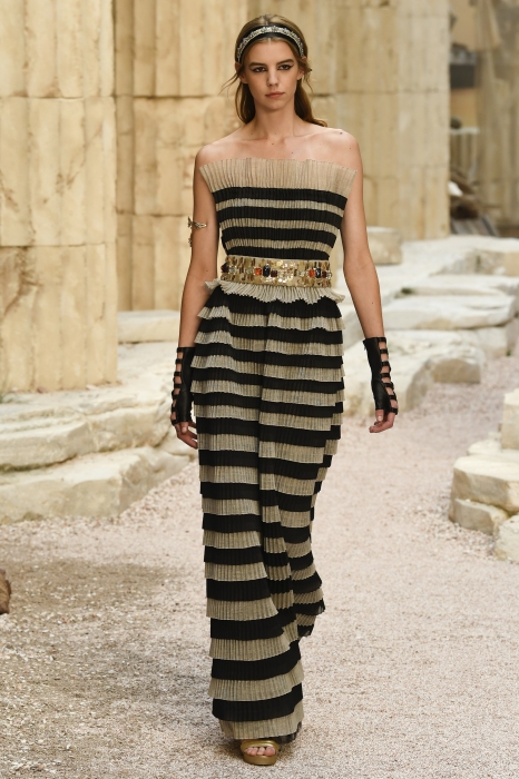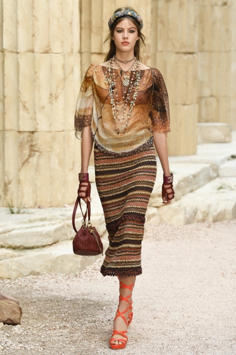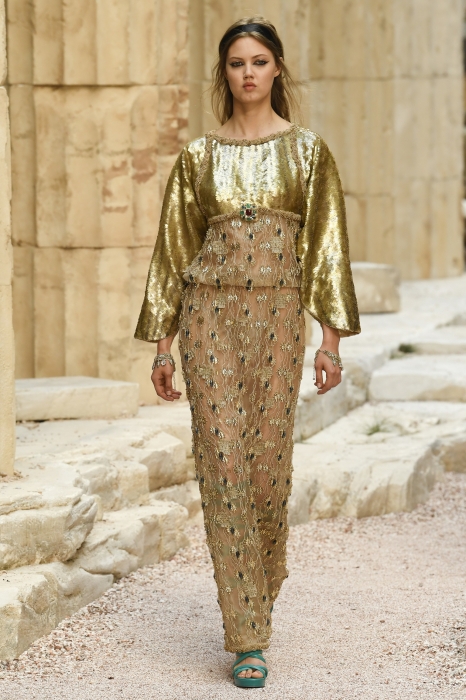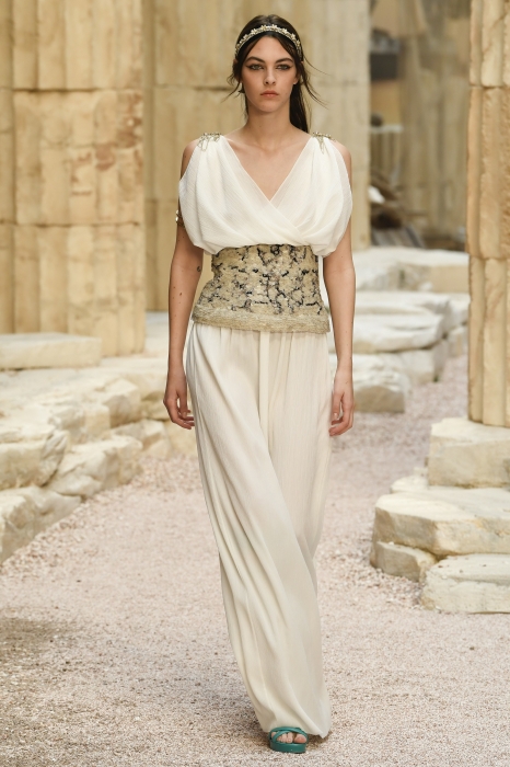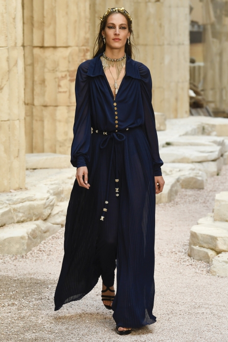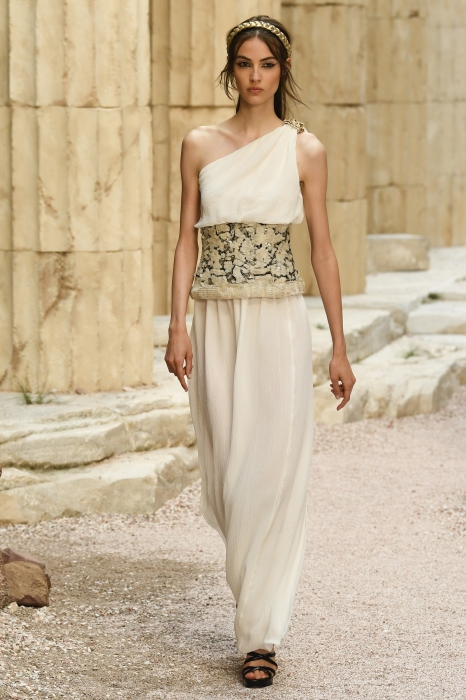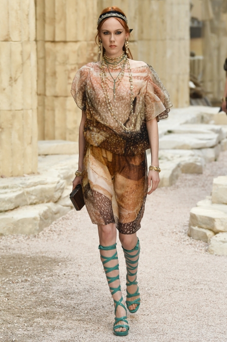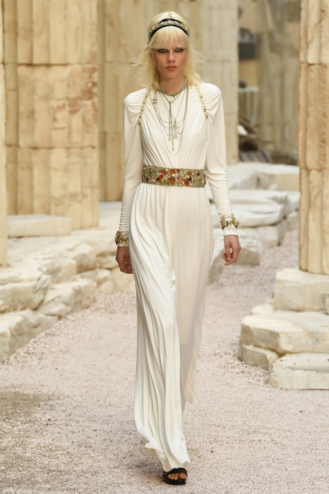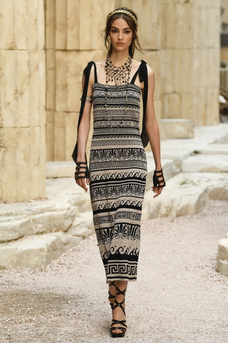 Куба, Сеул или Дубай: Chanel традиционно выбирают для круизного шоу город и посвящают культуре страны целую коллекцию. В этом году Лагерфельд остался в Париже, но организовал в Гран-Пале миниатюру Древней Греции. Тема выбрана не стихийно. В 1922 году Жан Кокто доверил Коко Шанель создание костюмов для собственной версии греческой трагедии «Антигона» с декором Пабло Пикассо. А в центре квартиры Коко Шанель стояла статуя Венеры без головы Праксителя. Как рассказывает Лагерфельд, мадемуазель часто обращалась к работам древнегреческого скульптора, чтобы объяснить видение формы и тканей.