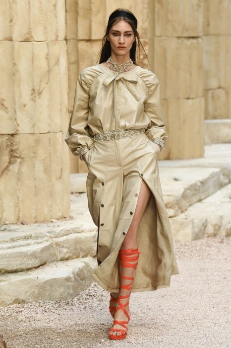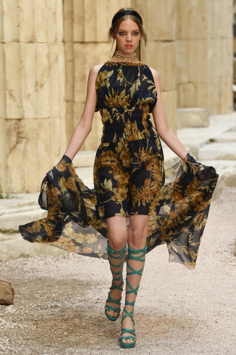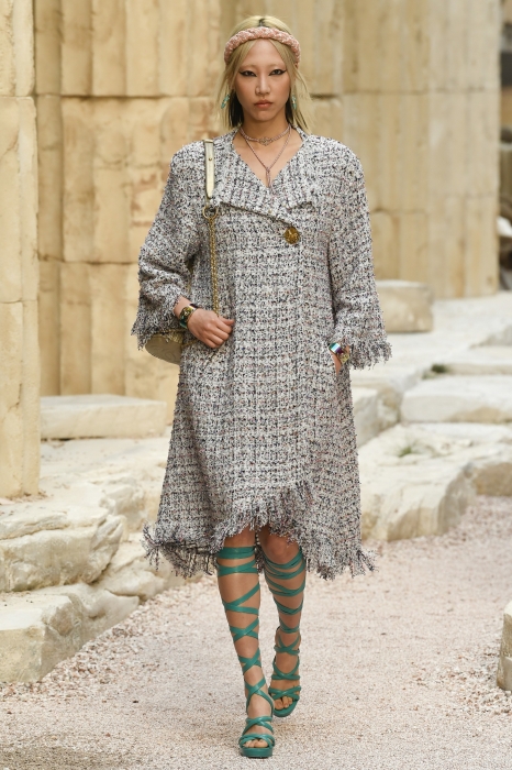 Палитра твидовых костюмов из круизной коллекции напоминает о мраморе, фактуры туник ассоциируются с древнегреческими скульптурами, шифоновые платья с завышенной талией повторяют наряды, в которых принято изображать богинь. А каждый образ из коллекции сопровождают сандалии с высокими завязками — разумеется, греческие.