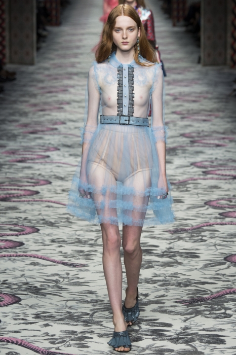 Однако большинство женщин все еще сторонятся прозрачной одежды и за незнанием, как ее носить, прячут свою сексуальность в мешковатые худи. Для ответа на открытый во всех смыслах вопрос, необходимо определить границы своей решительности. Тем, кого закатанные глаза общественности не вгоняют в краску, можно пуститься во все тяжкие (или «легкие», учитывая плотность ткани) и надеть шифоновое платье прямо на голое тело. Этот вариант мы видели в коллекциях брендов No.21, Coach, Saint Laurent и Gucci, которые возвели обнаженность в культ и ежесезонно поддерживают тег «free the nipples».