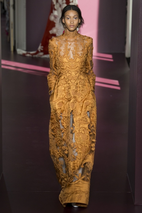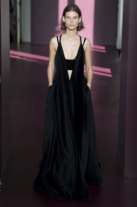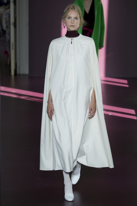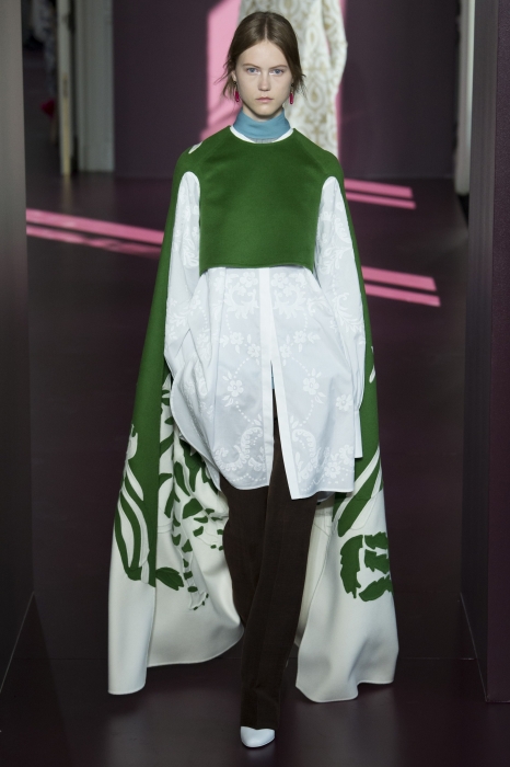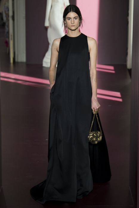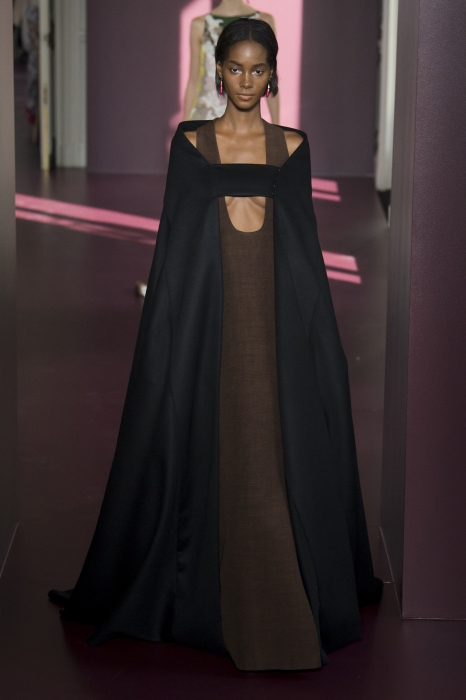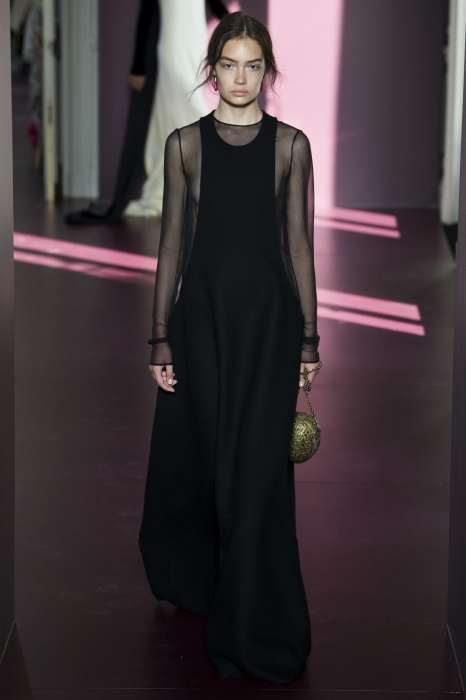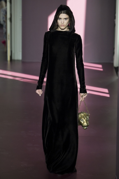 В своей второй сольной коллекции Valentino Couture Пьерпаоло Пиччоли провел параллель между сакральным в церкви и в Высокой моде. Ее главный референс — полотна испанского художника Франсиско де Сурбарано с его кардиналами, епископами, монахинями и мучениками. Их образы проглядывались в кейпах с капюшонами, платьях, похожих на рясы священников, и кованных металлических сумках с эмалевой мозаикой — результат коллаборации дизайнера с ювелиром Харуми Клоссовки де Рола. Аксессуары в виде голов животных обозначали семь смертных грехов и контрастировали с закрытыми нарядами свободного кроя, однотонными пальто и прозрачными «голыми» платьями, в которых уж точно нет ничего святого.