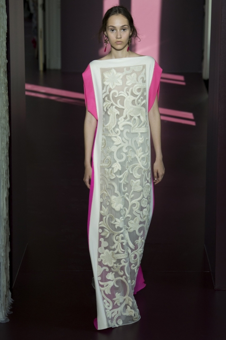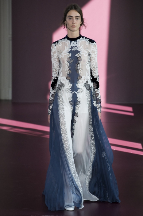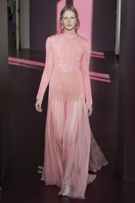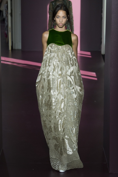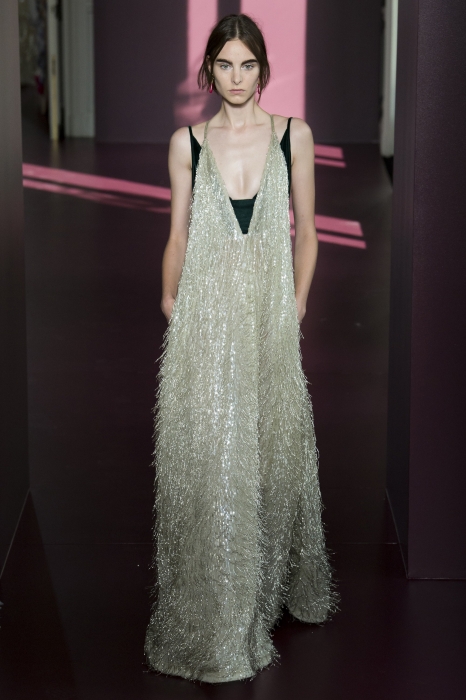 Во второй части показа Пьерпаоло обратился к убранству соборов и красоте богослужений: об этом сказали архитектурный крой нарядов, декор, имитировавший лепнину, а также богатые ткани — шелк, парча и плиссированный шифон с бархатным рисунком. Каждой вещи в коллекции дизайнер старался придать кутюрный толк: простые юбки были сделаны из полосок с изумрудными перьями, а платья-ночнушки декорированы стеклярусом и обильной бахромой с бусинами.