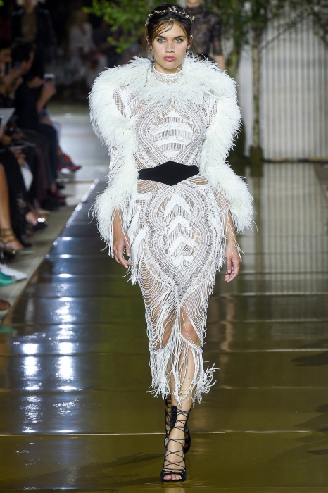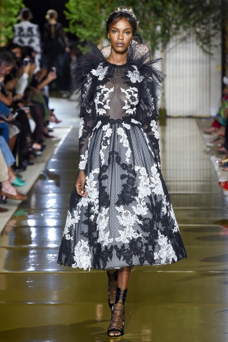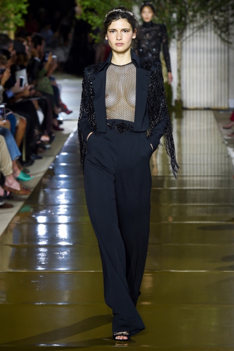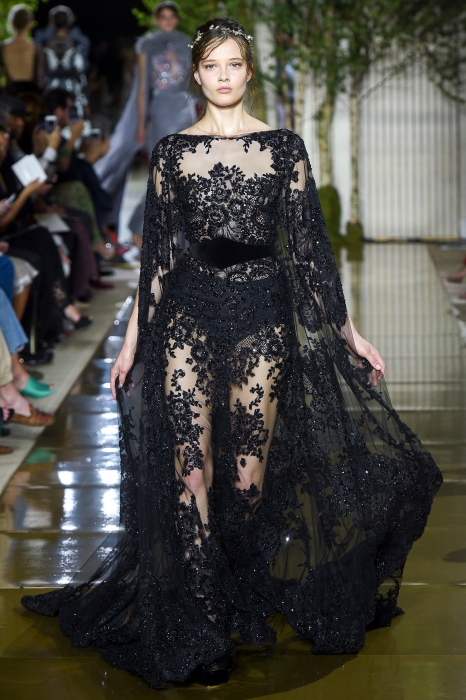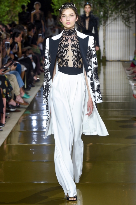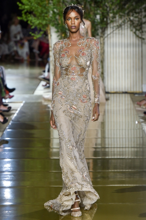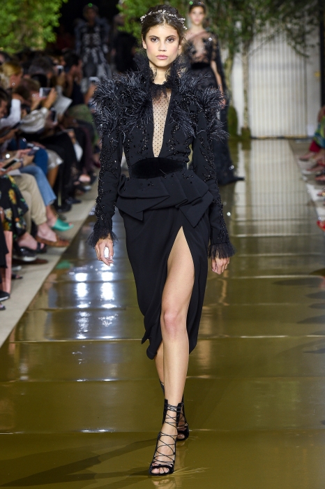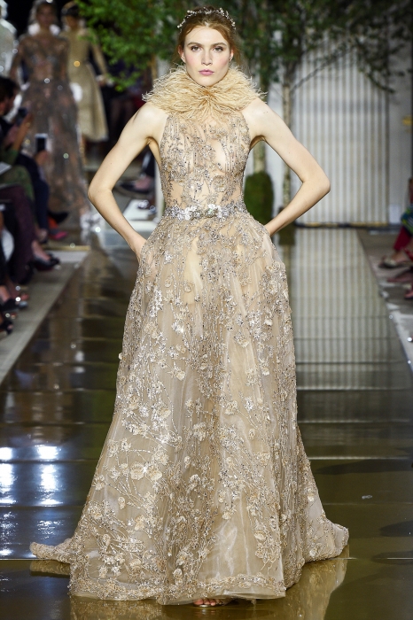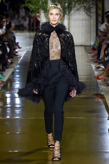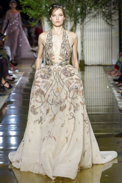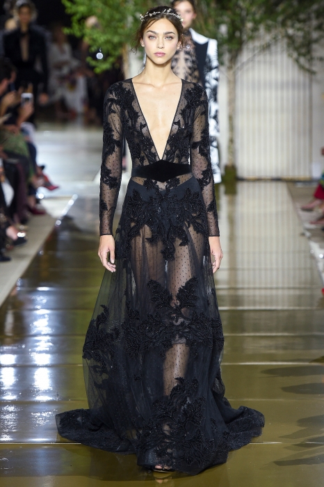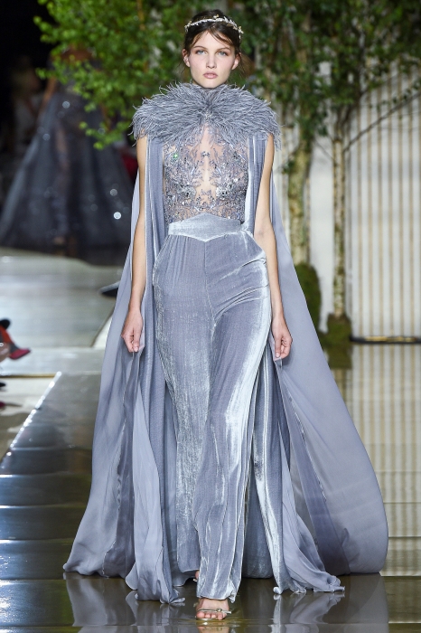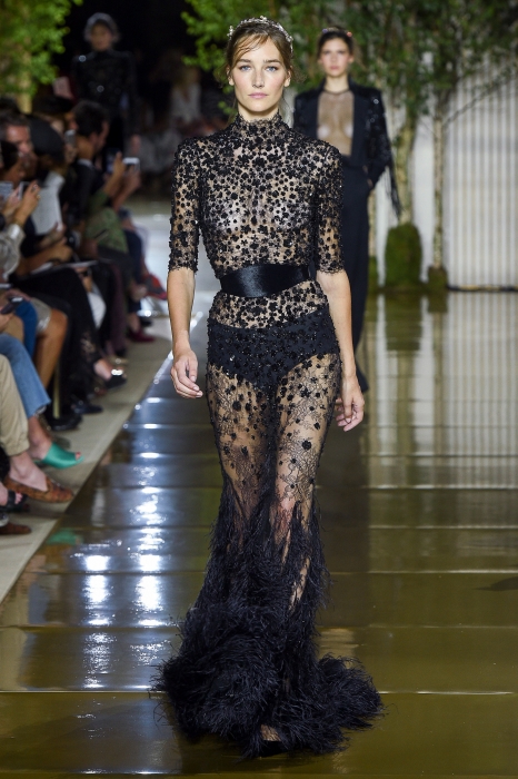 Первая часть показа — парад монохромных платьев из шелка, сетки, расшитого бисером фатина и страусиных перьев, которые отсылают нас к еще одному модному десятилетию — «ревущим» 20-м. Из черного регистра наряды быстро перешли в приглушенную палитру пастельных оттенков: это бархатные комбинезоны с летящим шлейфом, кейпы с изображением чертополоха (Эдвардианского символа верности) и любимые Зухаиром «голые» платья, в которых было невозможно определить, где заканчивается иллюзия и начинается тело. «Из-за своей вышивки и орнаментов одежда кажется очень тяжелой, — описывал коллекцию дизайнер, — но на самом деле, они почти невесомые. Женщины сегодня хотят летать, чувствовать себя комфортно и быть счастливыми. А я всегда считался главным дамским угодником».