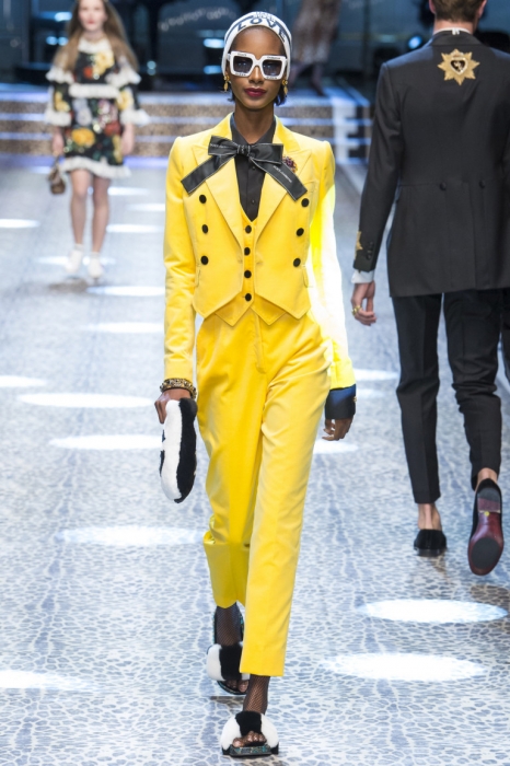 Желтый, хотя и не вошел в список Pantone, появился едва ли не во всех подиумных коллекциях. Где-то локально — в цвете колготок или сапог, где-то тотально — в луках из костюмов-троек, меховых пальто и бархатных платьев. Что важно, в канареечном, лимонном, грушевом и шафрановом стали делать куртки и дождевики, а значит, в толпе угнетенных погодой петербуржцев стопроцентно найдутся жизнерадостные модники.