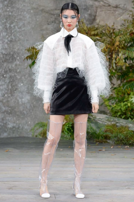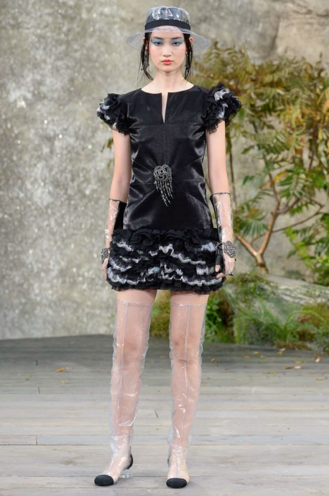 Из пластика Карл сделал даже классические сапоги Chanel c черным мысом и пяткой — в прошлом сезоне они были усыпаны стразами и сочетались с такими же блестящими колготками. Теперь в фирменной обуви можно ходить не только по ровному асфальту и паркету отеля W, но и по колдобинам российских дорог, в которые после осадков «набивается» грязь и слякоть. Универсальность обновки проверили на месте — для этого в Гран-Пале разбили настоящий гигантский водопад. Хотя после копии Эйфелевой башни и запуска ракеты привет из Ниагары не кажется нам чем-то необычным.