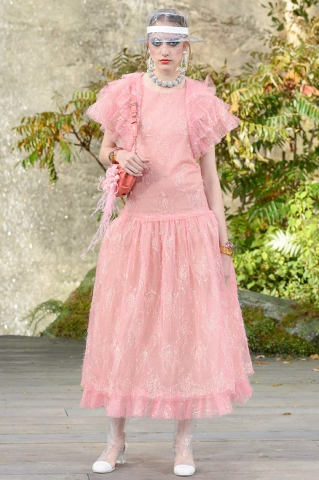 Футуристичный аксессуарный ряд дизайнер дополнил надетым на плечи конусом, который нам показался очень знакомым. В августе мы нашли похожий на AliExpress — китайцы носят его вместо зонта и продают на сайте по ценам до 800 рублей. Хотя в России чудо-штука не прижилась (по крайней мере, мы не видели ни одного ее покупателя), копипаст люксовыми брендами был предсказуем. И вот Chanel кастомизировали «пальто-крышкой» укороченные топы с бахромой, платья на бретелях и удлиненные розовые футболки.