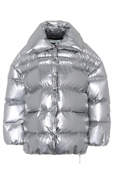 Футуристический пуховик-антидепрессант Off-White нужно сочетать с асимметричными платьями на тонких бретелях — как на подиуме. (DayNight)