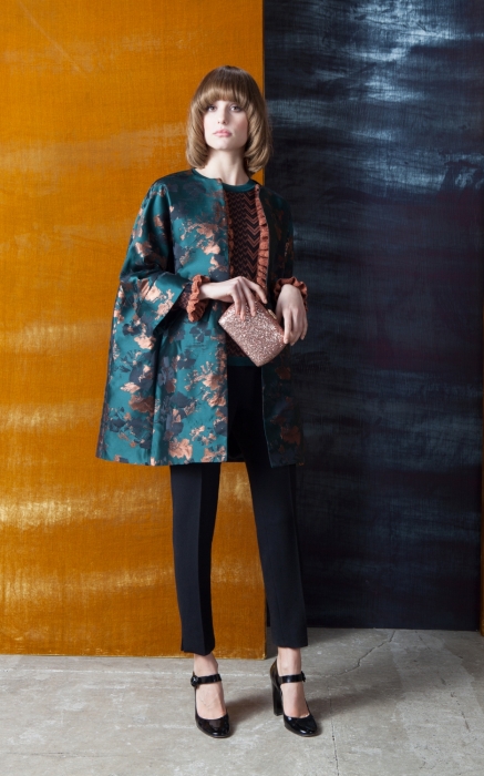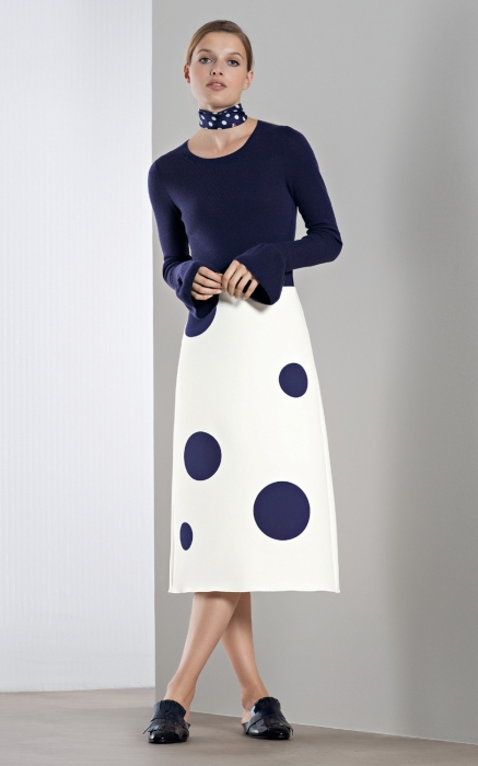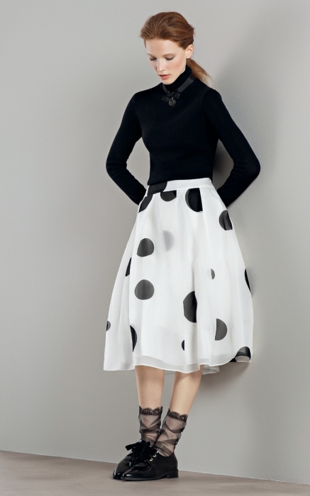 «Не клеткой единой!» — подумала креативный директор немецкой марки Marc Cain Карин Файт и сделала ставку на горох. Этот рисунок в силуэте new look напоминает ультраженственные послевоенные коллекции Кристиана Диора. Но это не прямая копия — в соответствии с эпохой перепостмодерна принт стал намного крупнее и больше напоминает случайные кляксы на чистом холсте, чем орнамент на юбке. («Гранд-Палас»)