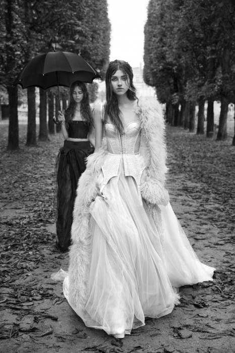 У Веры Вонг все было ровно наоборот: сначала она открыла бутик с подвенечными платьями (и собрала на свадьбу себя, Викторию Бэкхем, Иванку Трамп и Дженнифер Лопес), а потом запустила производство повседневной одежды — черной, готичной, в духе минимализма. Причем чем спокойней становились ready-to-wear коллекции, тем больше драпировок и меха было в свадебных образах — в этот раз Вонг даже вытащила из исподнего корсет с подтяжками и предложила носить его поверх платья (вместе с боа и перьевой шляпкой, как у танцовщиц французского кабаре).