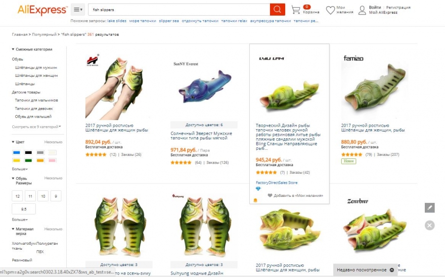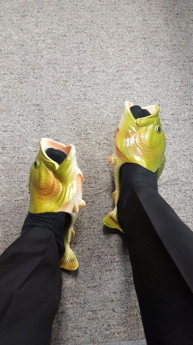 После того, как Balenciaga вывели на подиум «кроксы» (на которые рисковые фэшн-гуру уже копят деньги), в интернете запустили флешмоб самой уродливой обуви. Пока выигрывает пользователь Reddit с ником TrentWatts — он купил на Amazon тапочки с головой рыбы и ходит в них на работу, комбинируя с деловым костюмом. Рыбошлепки по цене от 16 до 27 долларов в зависимости от цены (1-1,5 тысяч рублей на русские деньги) интернет-магазин описывает так: «Экологичные, не токсичные, водонепроницаемые, износостойкие, легко чистятся, не разрушаются озоном, подошва не скользит, защищены от ударов, эластичные, противовозрастные». Последний эпитет окончательно убедил выстроиться в виртуальную очередь даже тех, кому немного за тридцать.