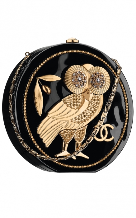 Ночная птица не случайно таращит глаза-кристаллы с изумительного лакового клатча Chanel. Круизная коллекция бренда — это путешествие Карла Лагерфельда в Древнюю Грецию. Круглая форма сумки