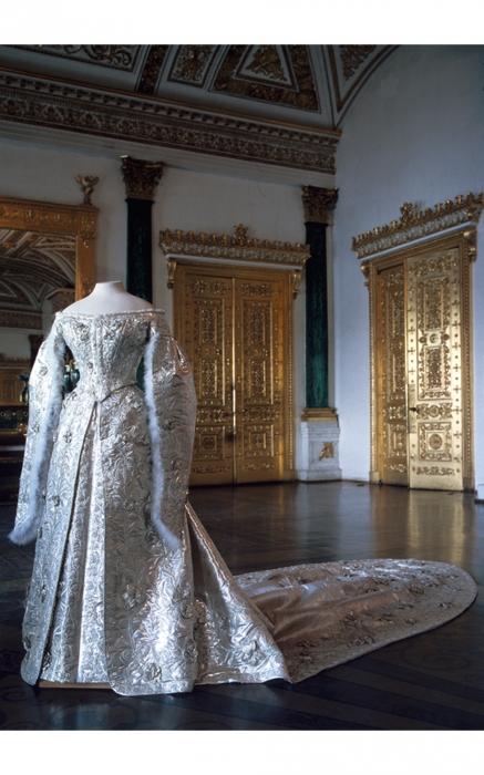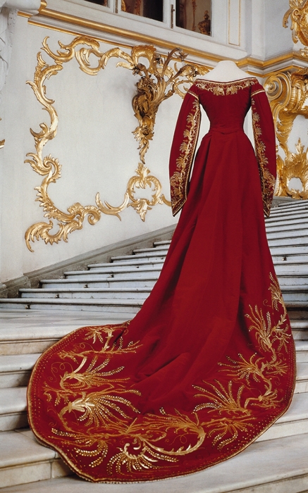Из гардероба Екатерины II уцелели лишь так называемые мундирные платья по форме гвардейских полков: лейб-гвардии Семеновского, Преображенского и Конного полков. Урожденная немецкая принцесса позиционировала себя как русская царица: она изобрела также «русские» платья, которые очень любила носить сама. Они состояли из нижнего платья, имевшего фасон сарафана, с присборенными рукавами на манер боярских и верхнего распашного с длинными откидными рукавами, напоминающими о костюмах XVII века.