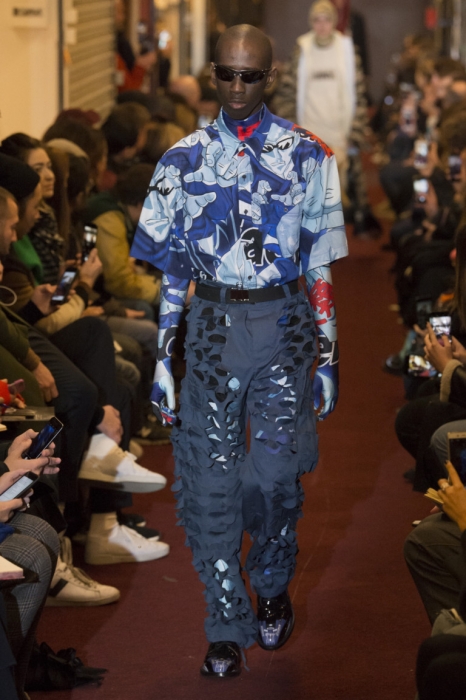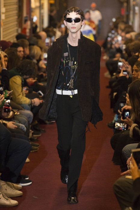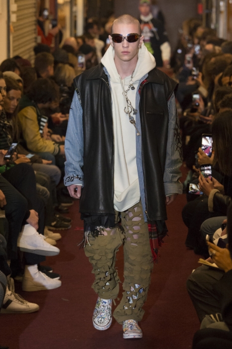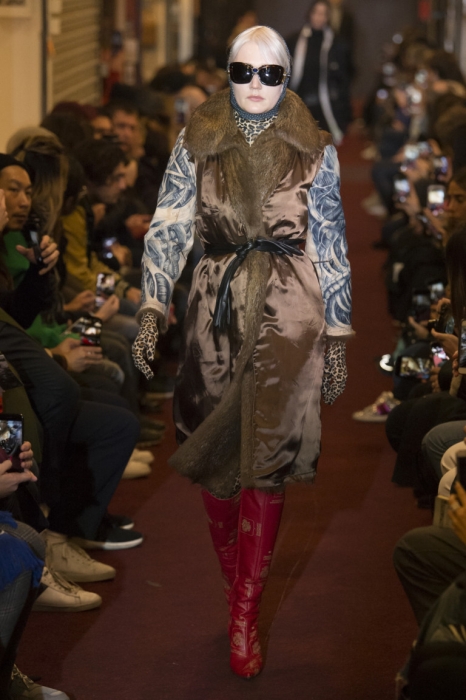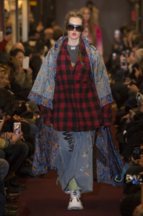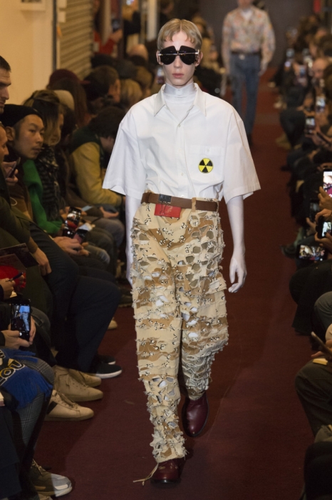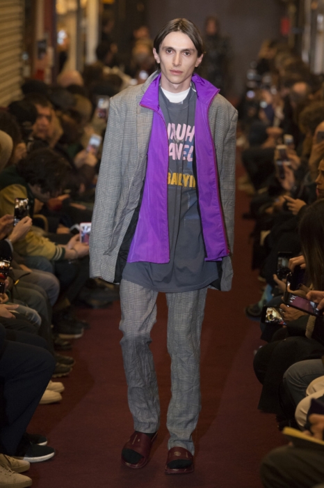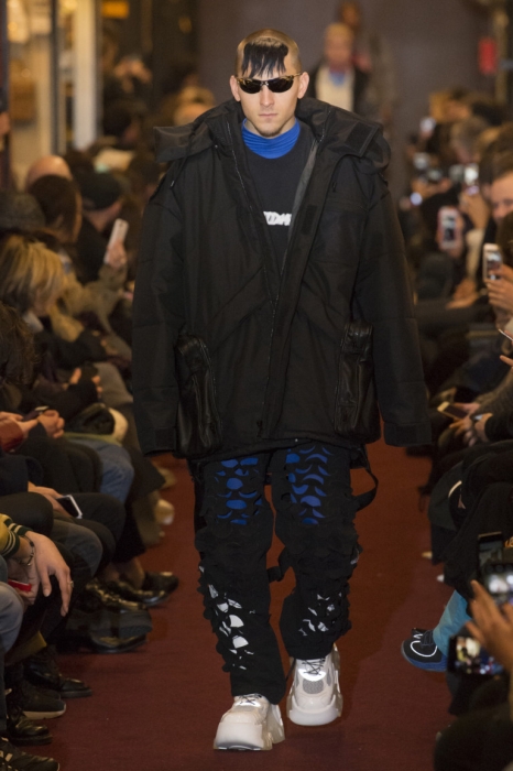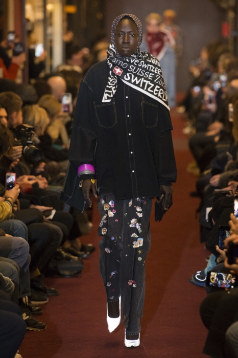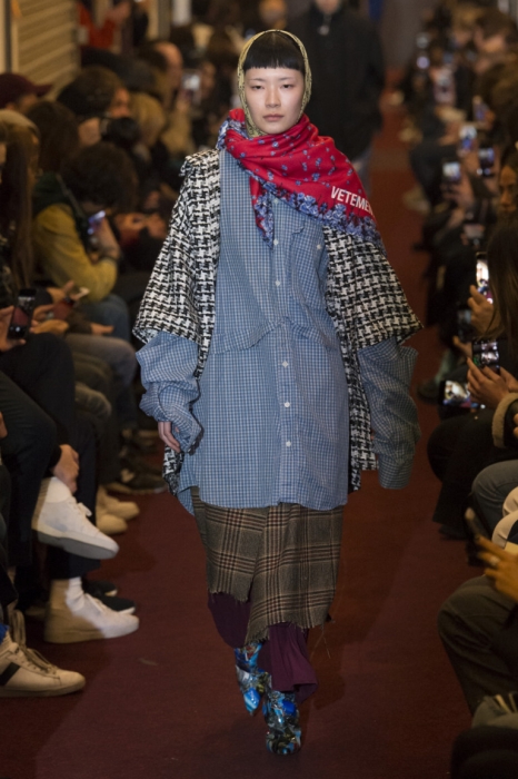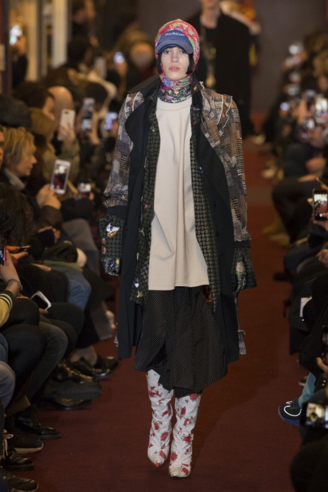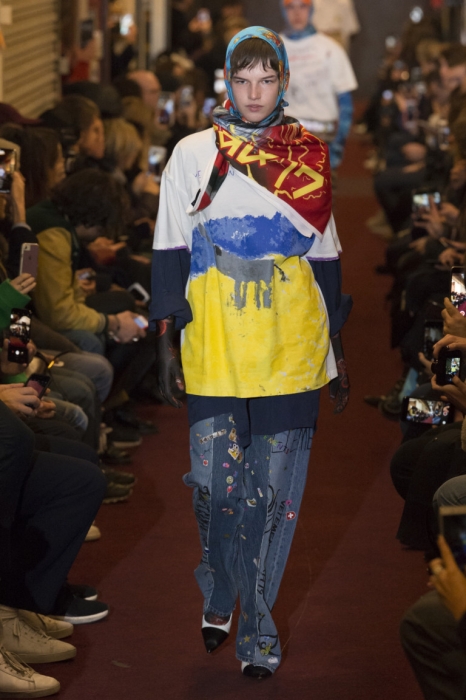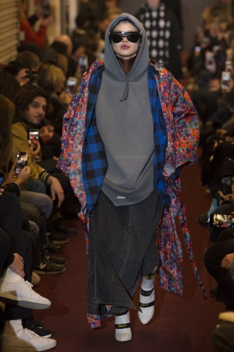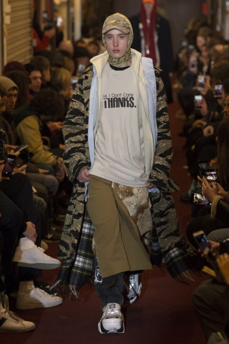 На объединенном (мужском и женском) шоу Vetements по традиции воспевали гопкор, нормкор и секонд-хенд стилистику. Только теперь — в еще более гиперболизированных формах: одна олдскульная вещь накладывалась на другую и дополнялась бабушкиной косынкой, мафиози-очками и арафаткой (мы уже и забыли это модное слово!). Лотта Волкова и Демна Гвасалия сделали стильными все грубейшие фэшн-ошибки: заправлять рубашку в штаны, носить юбку на брюки и приклеивать челку на лысину. Даже армейские шаровары (такие уже есть у Ким Кардашьян, Беллы Хадид и Елены Перминовой) — с нового сезона станут настоящим хитом, который можно натягивать до пупа и миксовать с рубашкой кислотного цвета (например, с лицом Мэрилина Мэнсона или флагом России).