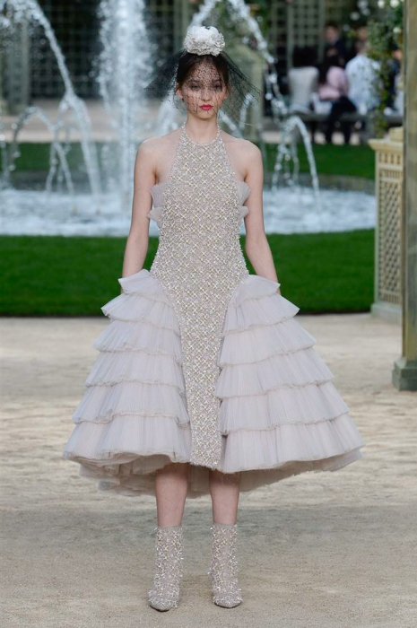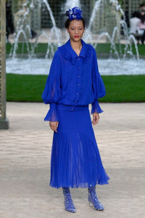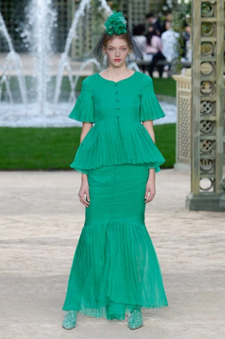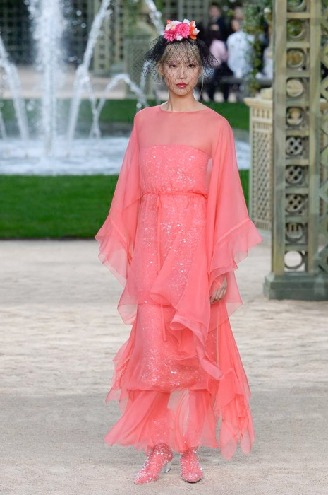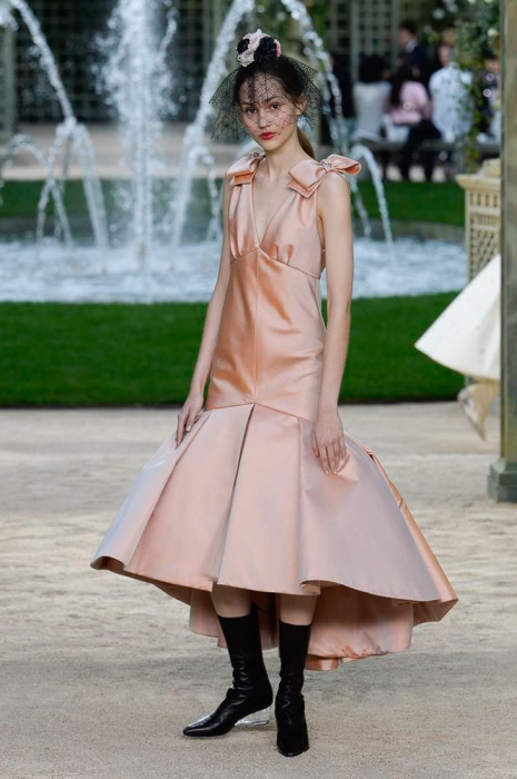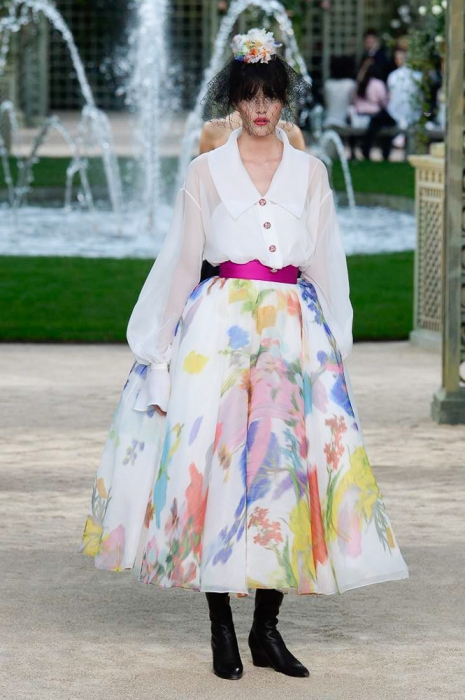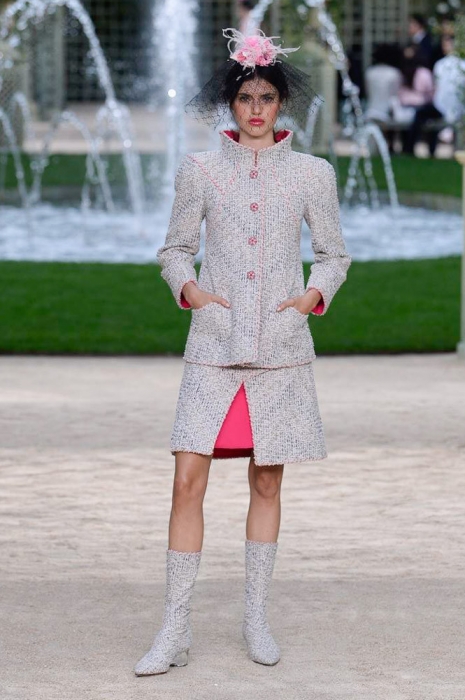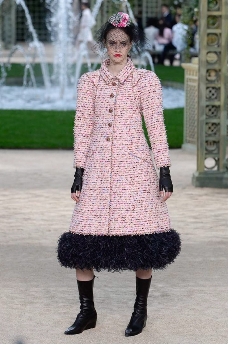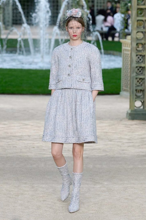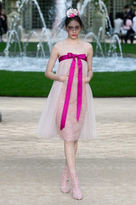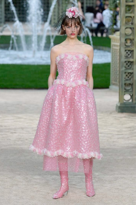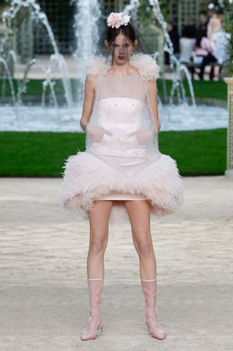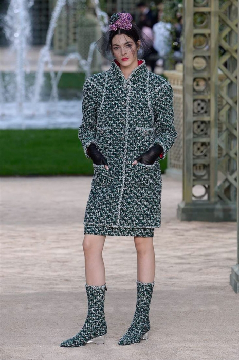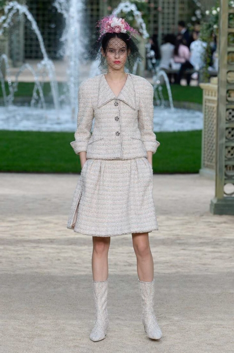Твидовые костюмы, актуальные в любой сезон начиная с 1920-х, сменились блестящими платьями, юбками с кринолином, ретро-костюмами ярких оттенков и ботинками в стразах — это самая интересная часть перфоманса, которая показывает будущие луки с киноцеремоний и мудборд дизайнера. В качестве новых референсов Лагерфельда — красота французских оранжерей и образ девушки-цветка, противопоставленный нормкору, оверсайзу и фем-тенденциям.