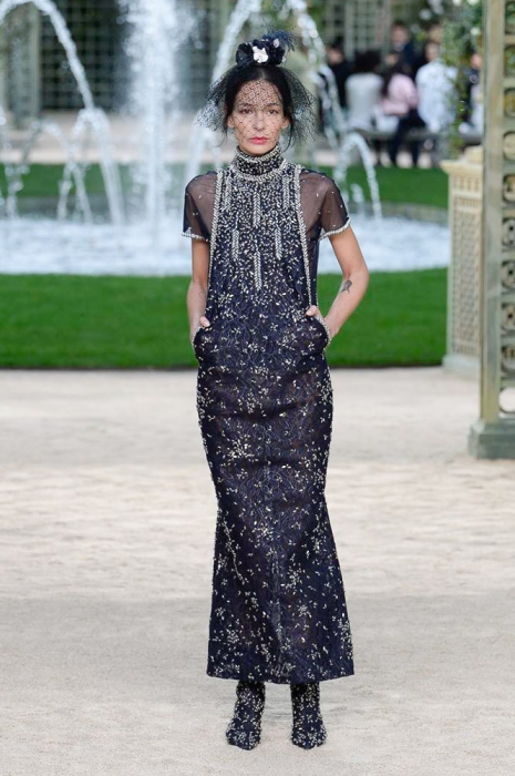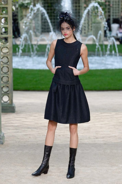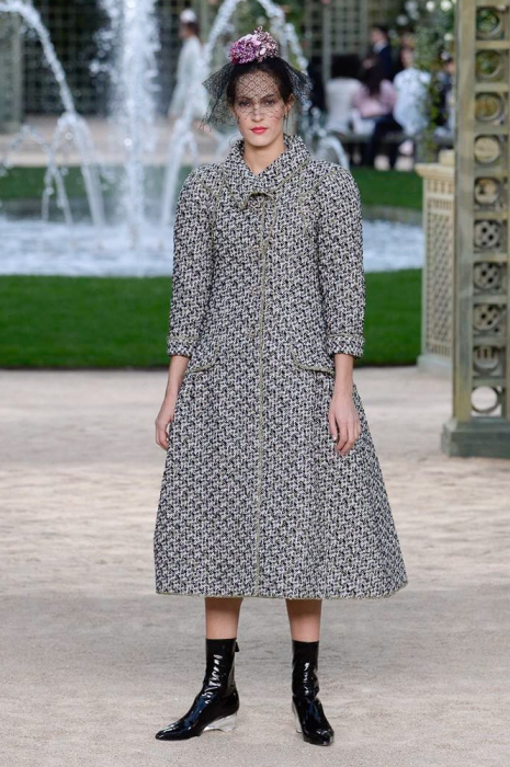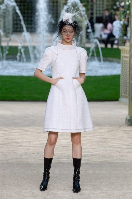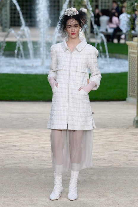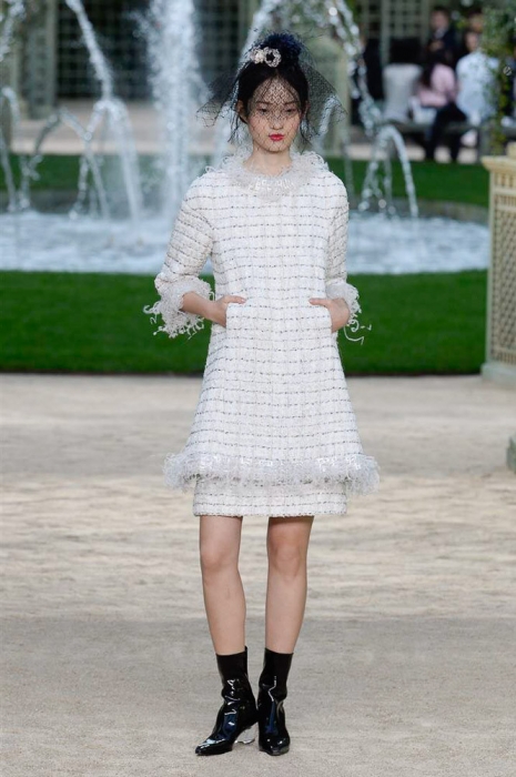 Никаких водопадов, гипермаркетов и запусков ракеты — на этот раз Карл Лагерфельд ограничился скромным садиком и фонтаном в центре парижского Гран-Пале. Сами комплекты с кутюрного показа Chanel тоже были консервативны (особенно если сравнивать с прошлогодними пластиковыми шляпами и плащами-непромокайками), а единственным новшеством первой части шоу были облегающие черные сапоги, в которых, кажется, теперь можно выходить на красную дорожку «Оскара».