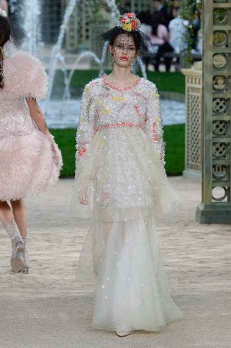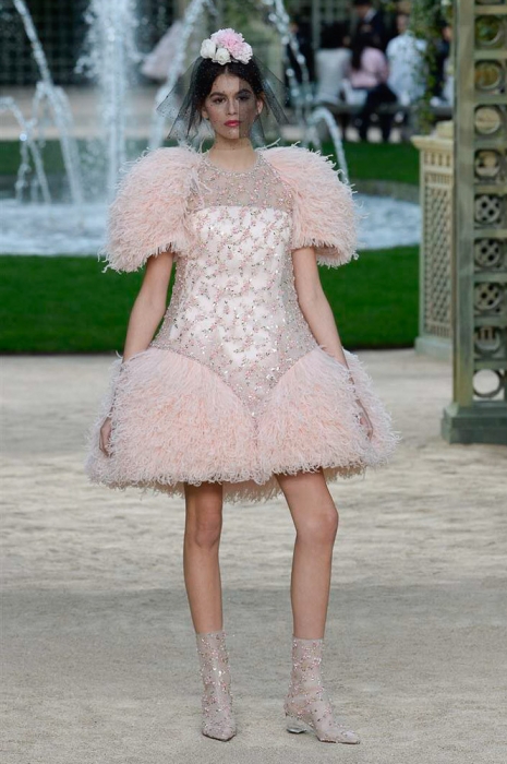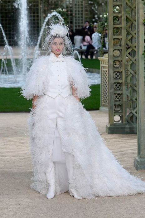 Завершился показ Chanel вереницей звезд моделинга (включая сестер Павловых, Крис Грикайте и Кайю Гербер), а также свадебным выходом вместе с племянником дизайнера Хадсоном Кронингом. Мальчик разбрасывал лепестки роз перед wedding-нарядом — строгим белоснежным костюмом с перьевой накидкой и шлейфом.