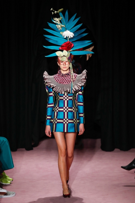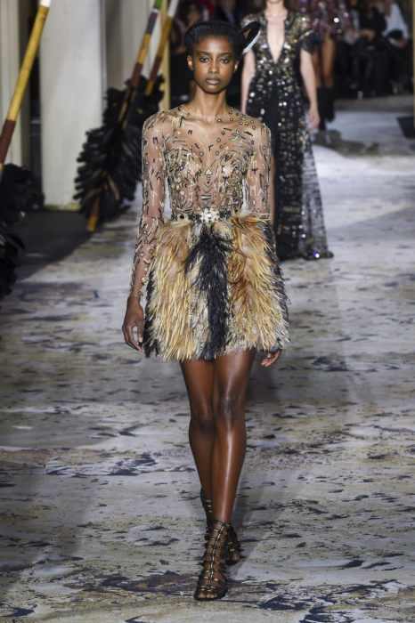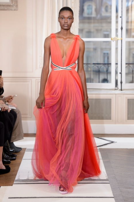 Из других старых-добрых трендов — спрятанное под слои тюля боди, бум страусиных перьев, открытые плечи и глубокое декольте, а также бахрома, доходящая до самой щиколотки (или превращенная в «кутюрный» пучок травы). Хотя дизайнеры в этот раз играли не с силуэтом или принтом платья, а со средствами стайлинга, добавляя в образ неожиданные (и даже порой экстремальные) элементы. Вместо традиционного ожерелья — шелковый бант (Elie Saab), вместо шляпы — космический шлем с голограммой (Maison Margiela), а на смену драматичной вуали пришла маска, напоминающая VR-очки (Dior).