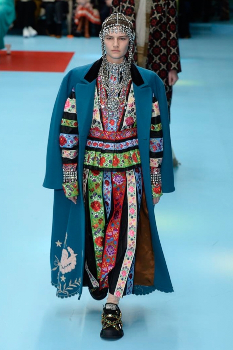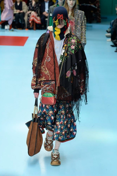 Среди других оммажей осенне-зимней коллекции — среднеазиатские национальные костюмы, японские аниме-мультфильмы, винтажные украшения ювелира Хэтти Карнеги, голливудский конвейер Paramount Pictures, конный спорт и сериал «Игра Престолов» — вместо сумок модели несли драконов, ящериц и змей. Сомневаемся, что они будут продаваться вместе с тюрбанами-балаклавами, топом из цепочек, бейсболками из коллаборации Gucci и New York Yankees, свитшотом «Kill Pussycat» и костюмами в защитных чехлах, но уже готовы назвать «питомцев» самой милой задумкой Алессандро Микеле.