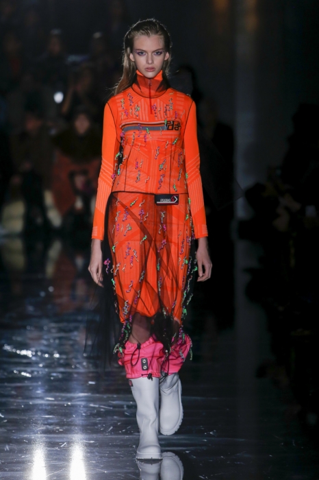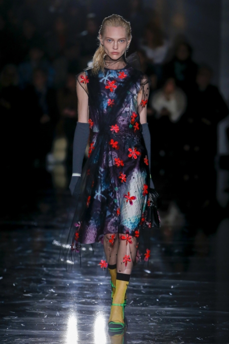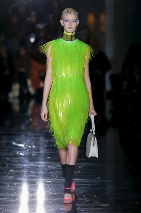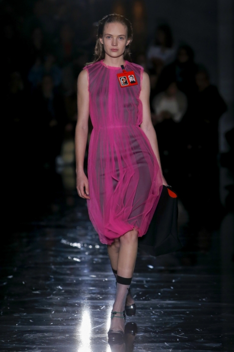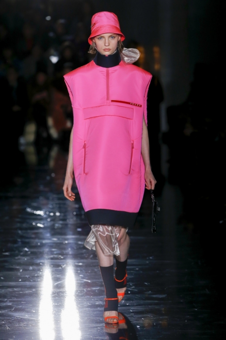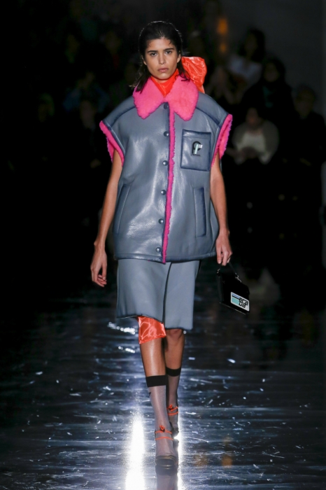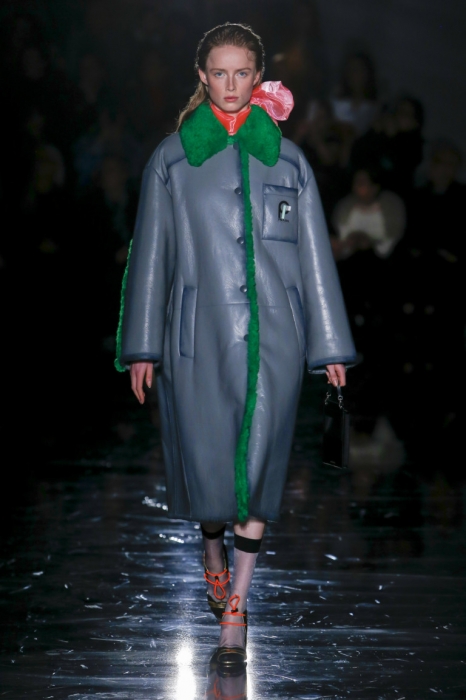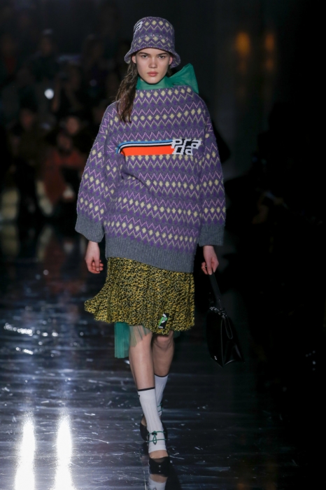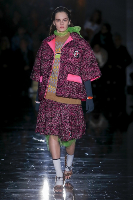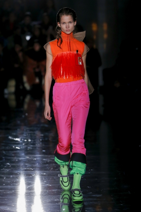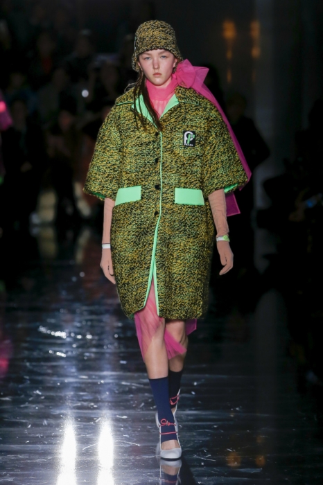 Неделя моды в Милане продолжается: вчера вечером осенне-зимнюю коллекцию показала Миучча Прада, которая снова воспевает футуризм, андеграунд и атмосферу мегаполиса. После комиксов и роботов, появившихся на шоу весна-лето 2018, Prada добавила в принты, цветовую гамму и силуэты отсылки к неоновым вывескам, городским служащим и токийским школам. Платья кислотных оттенков, от которых режет глаза, нагрудные бейджи с портретом моделей, бахилы из плотных тканей со шнуровкой и капроновые банты, завязанные на шее, — у героинь итальянского стритстайла теперь есть яркая замена ренессансным нарядам и поднадоевшему спорт-шику.