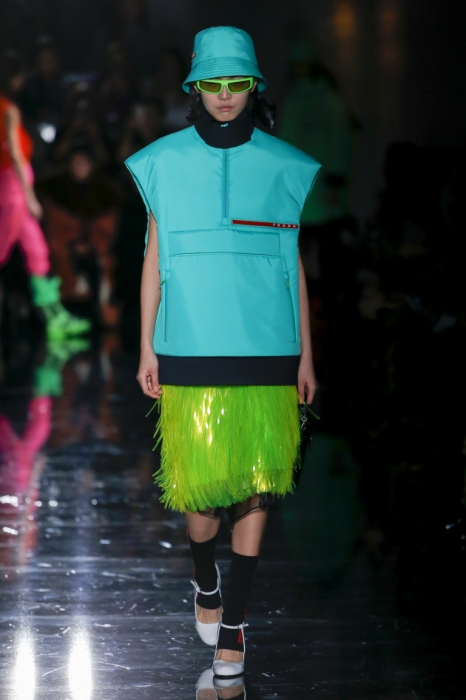 Во многих луках Prada цитировала сама себя: например, туфли с огнем, вырывающимся из гоночной турбины, уже были в весенне-летней коллекции 2012 года, а бирюзовые и розовые панамы не раз становились хитом после мужских показов. Кажется, марка затеяла челлендж с Instagram-аккаунтом @diet_prada, который ловит дизайнеров на плагиате и позорит на 300 тысяч подписчиков. Миучча показывает, что в архивах бренда осталось много чего интересного и за вдохновением необязательно идти к конкурентам.