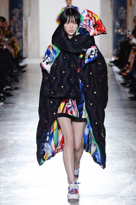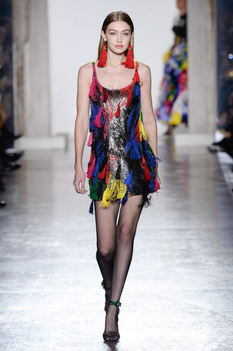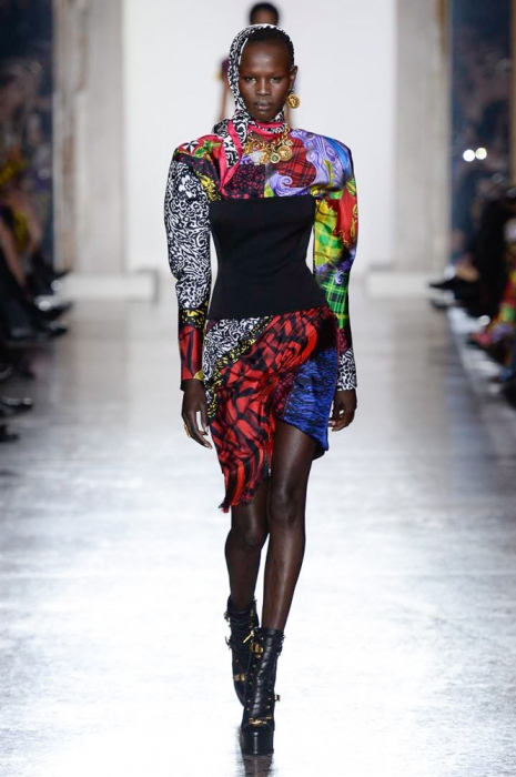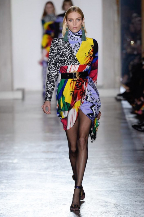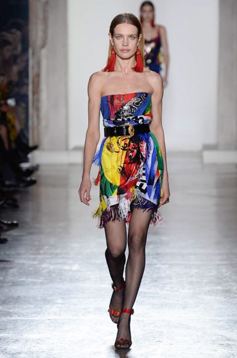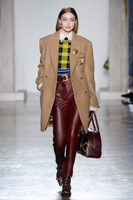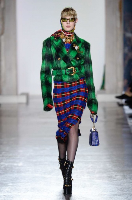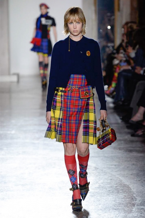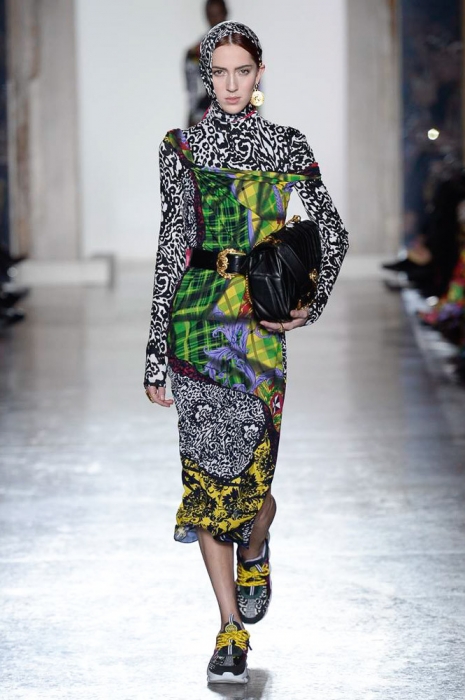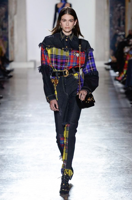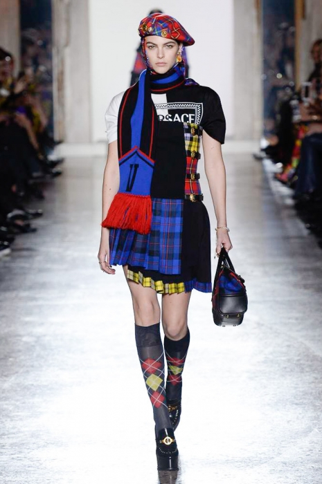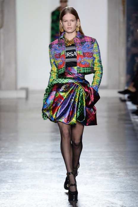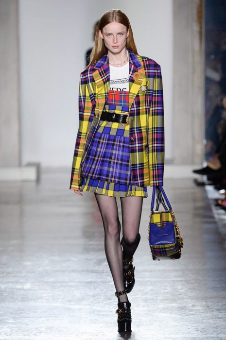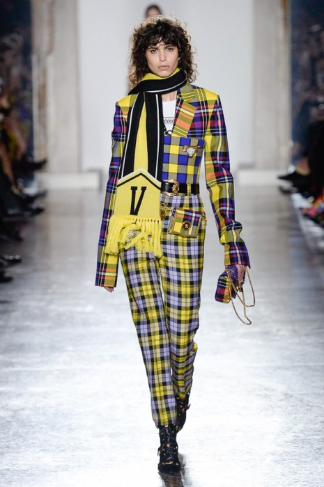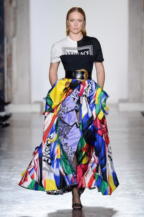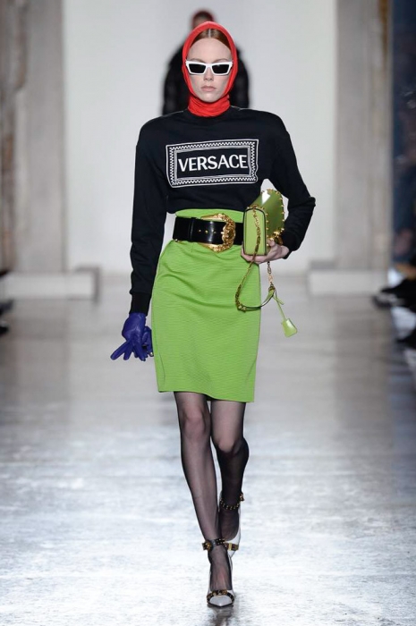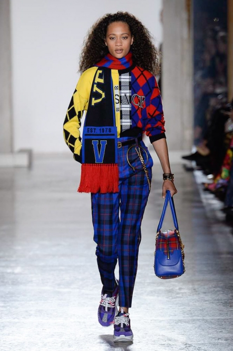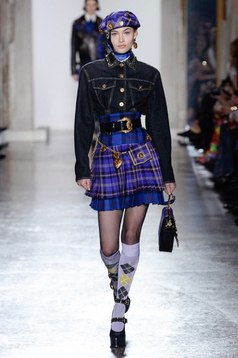 В плане референсов Versace тоже отказываются от общепринятого: если все повально увлеклись 2000-ми, то марка продолжает вдохновляться 1990-ми. После золотых платьев, комбинезонов из обложек Vogue и платков с принтами из архивов Джанни Версаче на первый план вышли школьная форма, фанатские шарфы, джинсы с пэчворком и юбки как у Алисии Сильверстоун в фильме «Бестолковые».