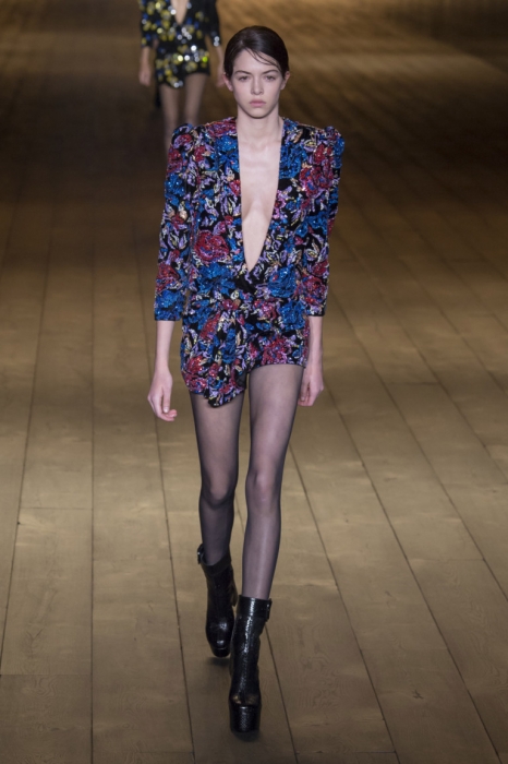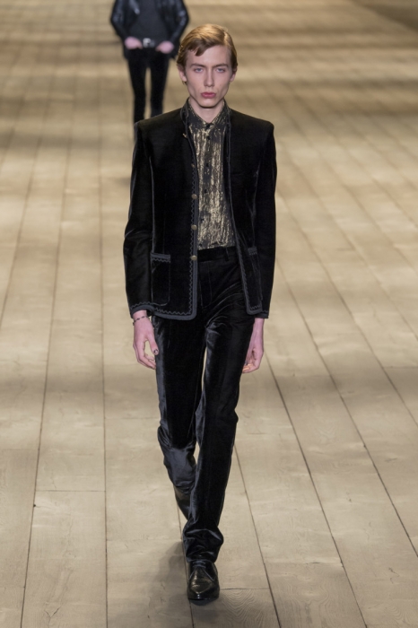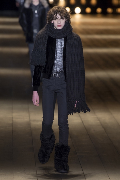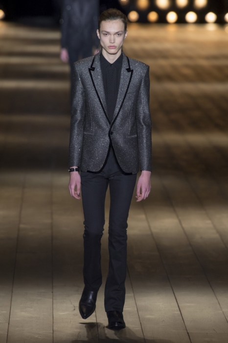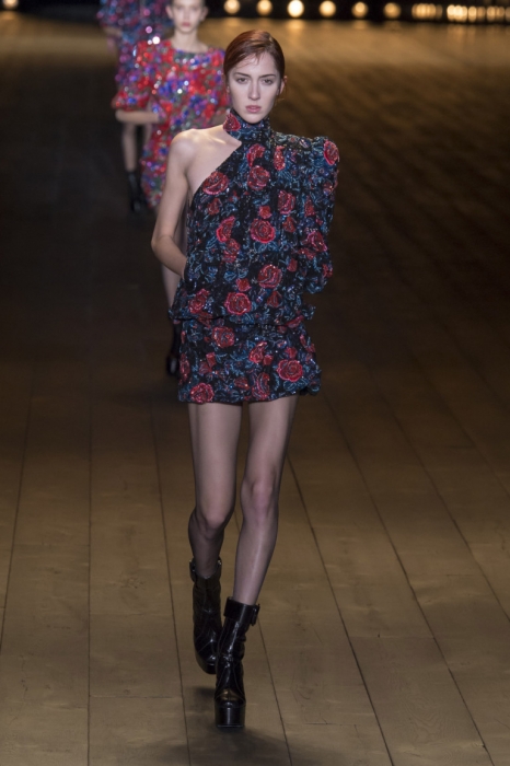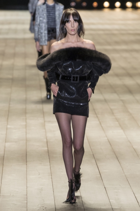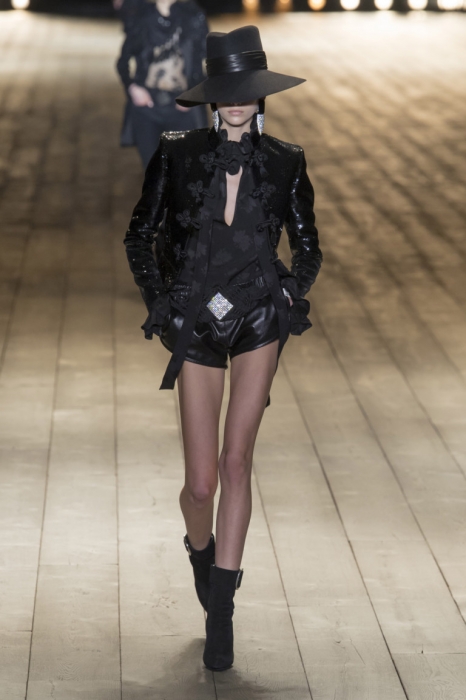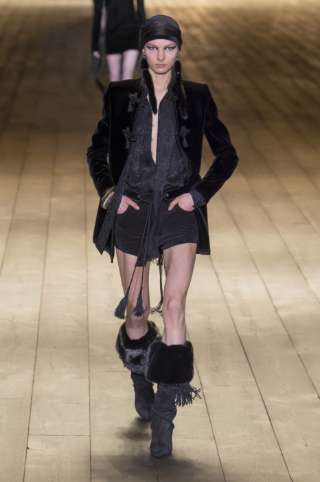 «С ориентацией на парижскую моду» — значит, с миксом пальто и мини-юбки, кожаного плаща и скинни-джинсов, тяжелых меховых ботинок и блестящей рубашки. С шиком, гранжем и присущей Saint Laurent помпезности, которая в этот раз вылилась не в сапоги с тысячами кристаллов, а в настоящие кутюрные платья, которые мы уже ждем на красной дорожке церемонии «Оскар».