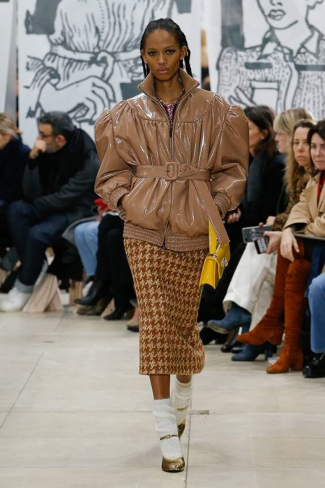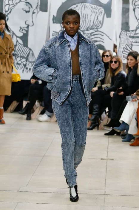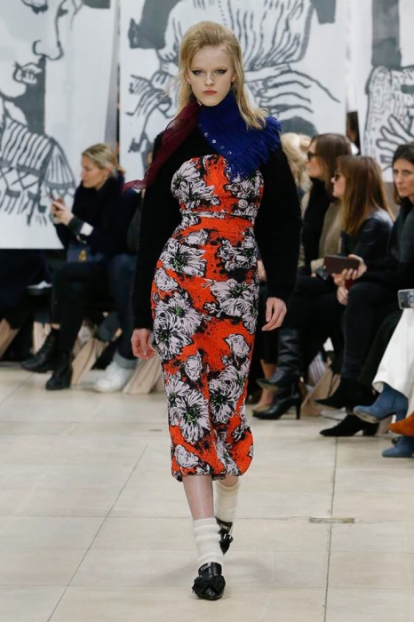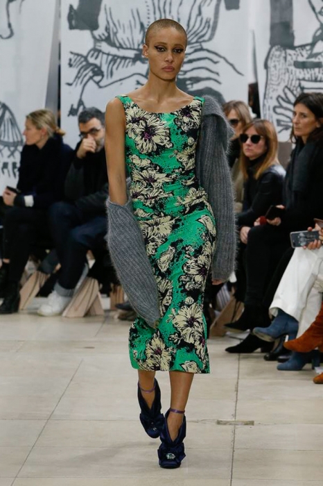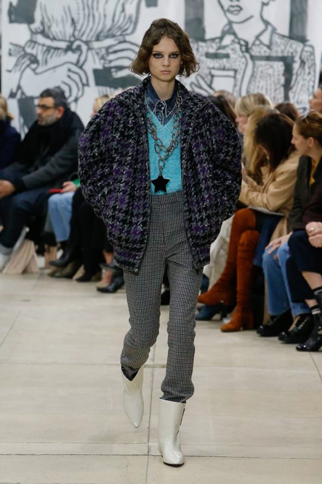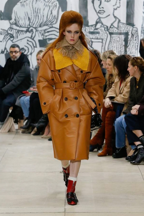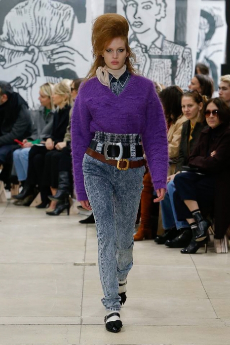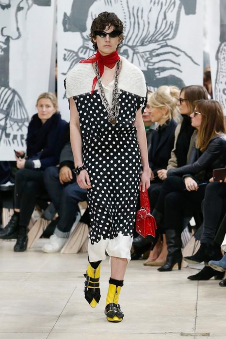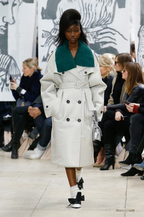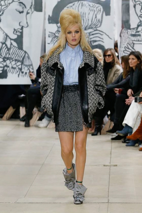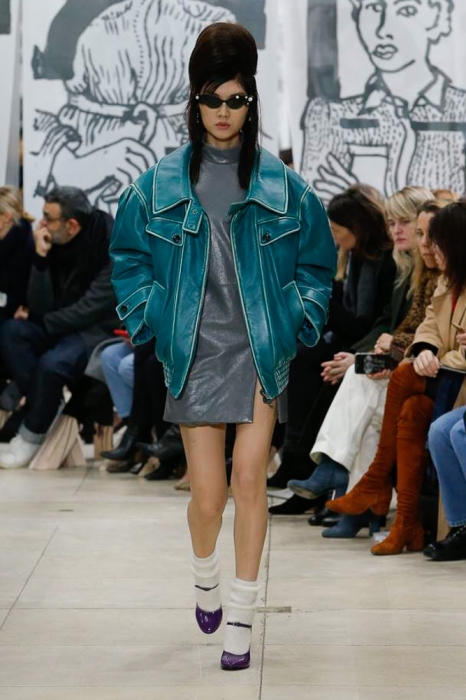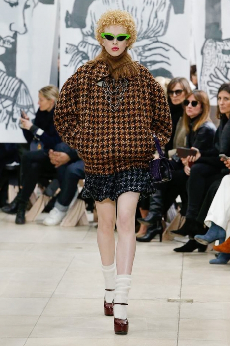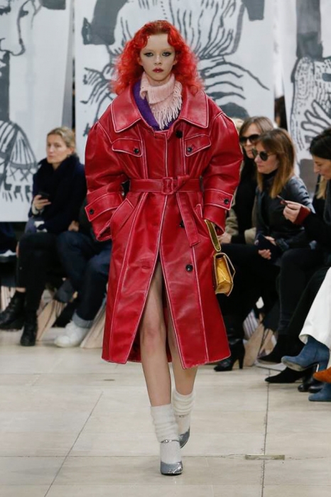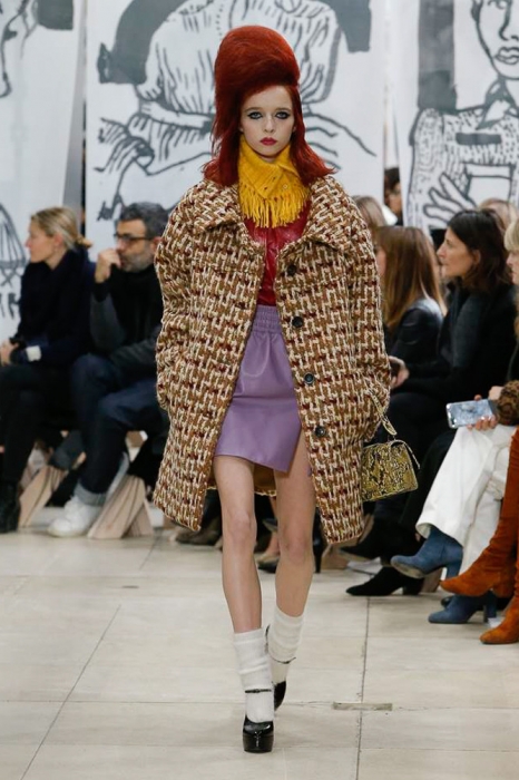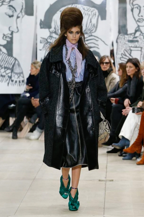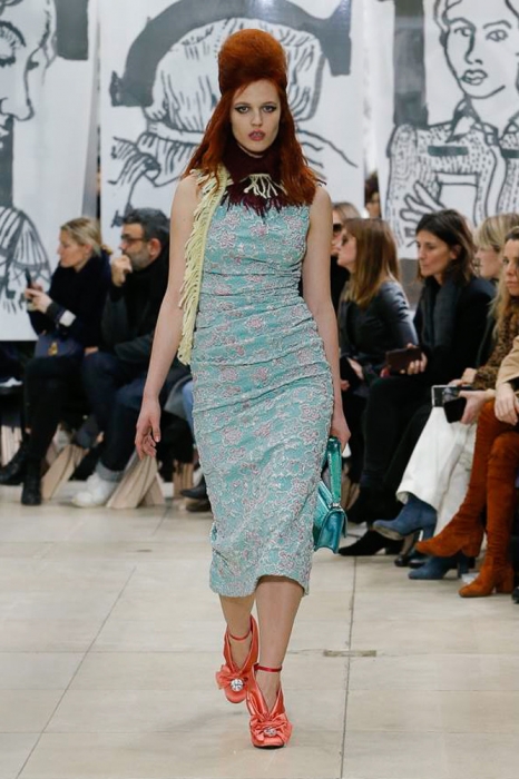 После нее на подиуме появились шоустопперы всех Недель моды: Адвоа Абоа, Джорджия Мэй Джаггер, Слик Вудс, Эди Кэмпбелл и 16-летняя дочь Синди Кроуфорд Кайя Гербер. Их образы Миучча Прада стилизовала под 80-е — с прическами как у Синди Лопер и Бонни Тайлер, мешковатыми платьями в горох, туфлями, надетыми вместе с плотными носками, джинсовыми тотал-луками и «оксфордскими» строгими кардиганами.