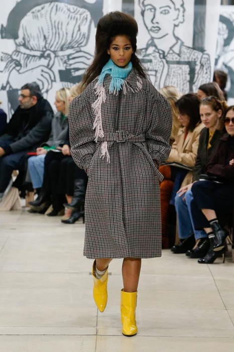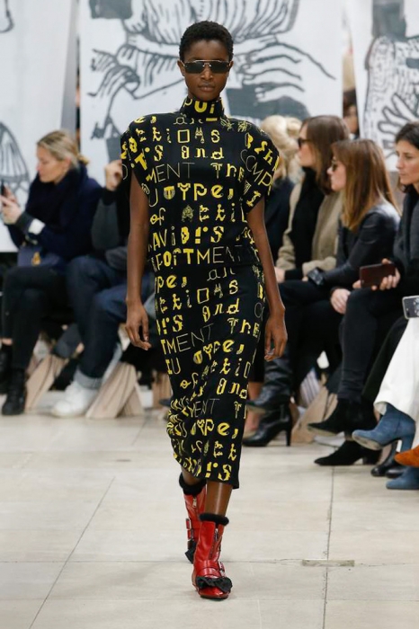 Сет-дизайн показа Miu Miu — монохромные портреты, выполненные маркером. На каждом нарисована буква алфавита, которая, по замыслу Миуччи, выражает определенное настроение и характер. Не исключаем, что скоро такими рисунками можно будет кастомизировать аксессуары бренда. А пока наслаждаемся стайлингом с показа — огромными «звездными» цепями, деконструированными шарфами, туфлями на высокой платформе и узкими, будто плавательными, очками.