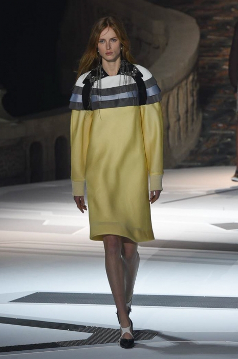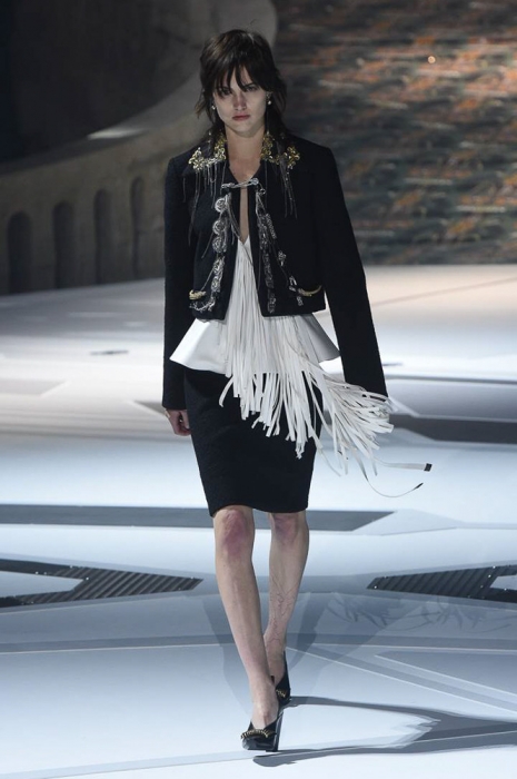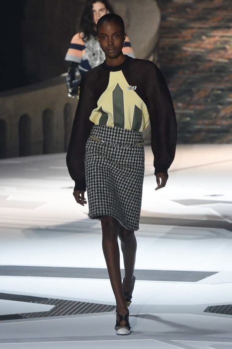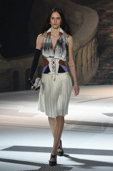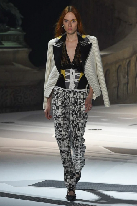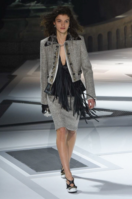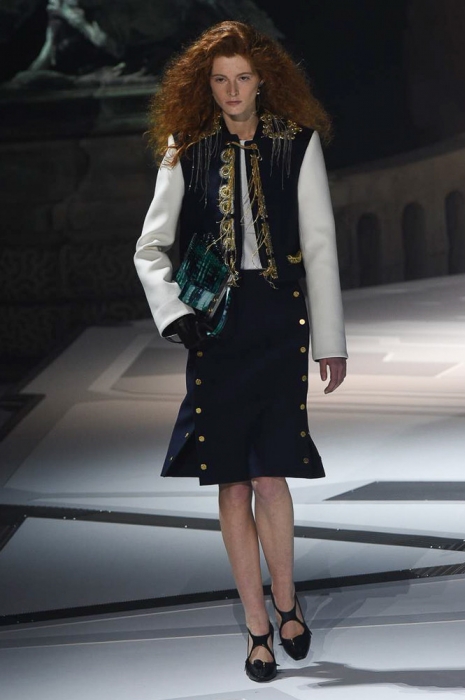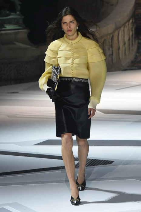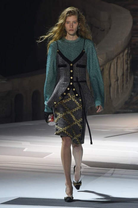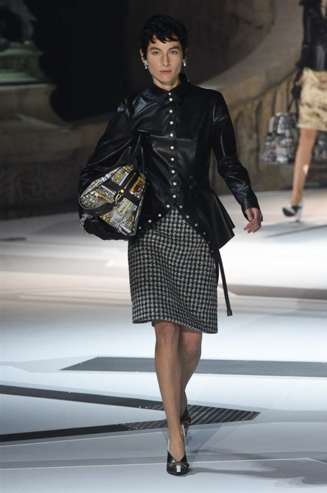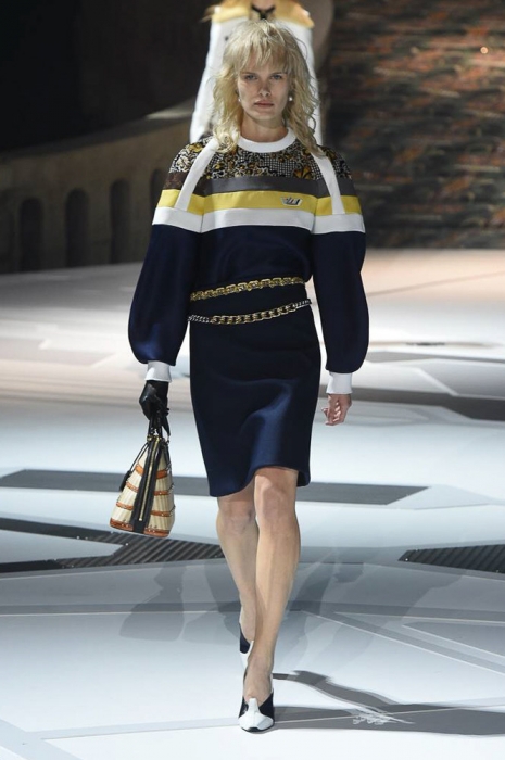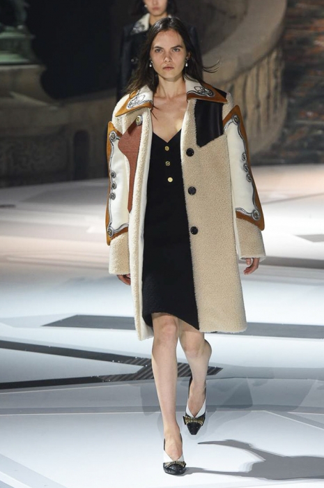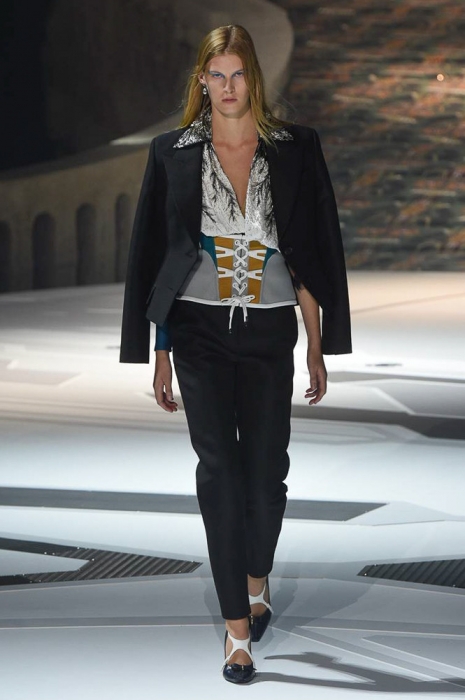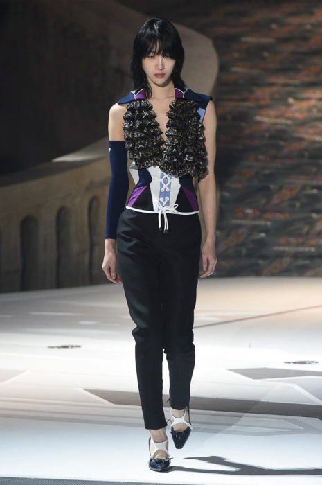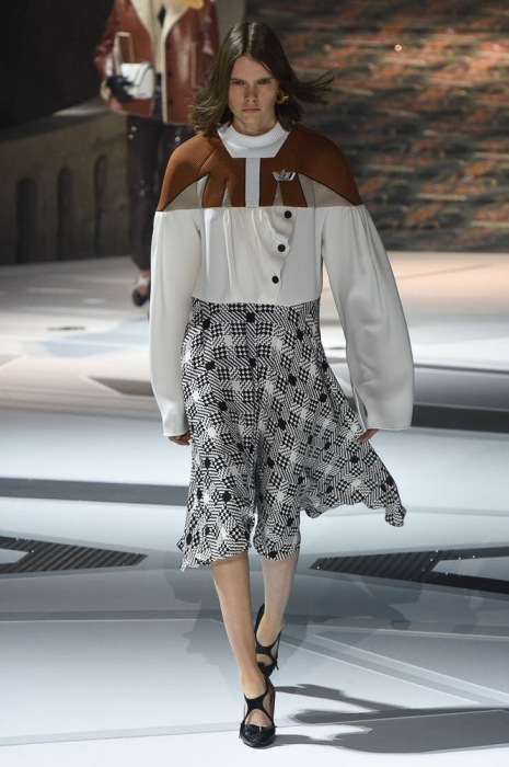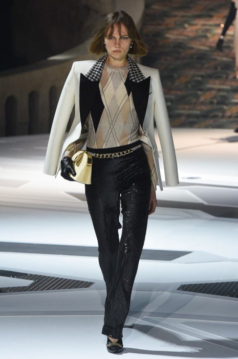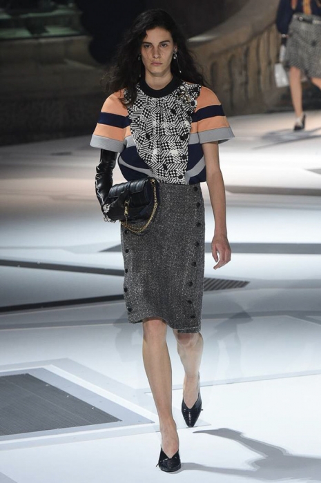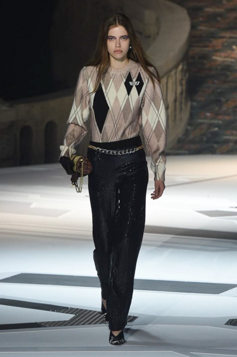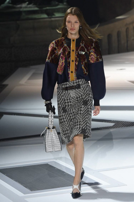 Louis Vuitton продолжает исследовать пространство Лувра: если прошлую, весенне-летнюю, коллекцию бренд показал на нижнем этаже Павильона Часов (построенном еще в 1620-х годах!), то презентацию новой, осенне-зимней, перенес в новый зал Cour Lefuel. Уже в локациях шоу прослеживается главный референс линейки — отношения прошлого с будущим, который подкрепляется сет-дизайном (подиум был сделан в виде космического корабля), стайлингом и самой одеждой.