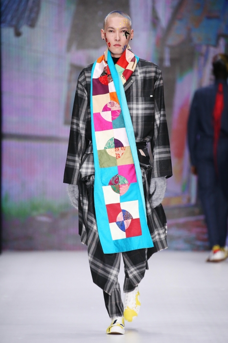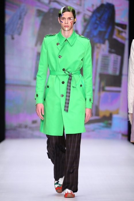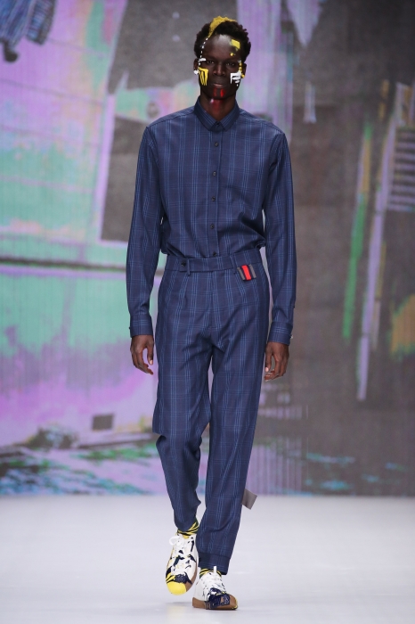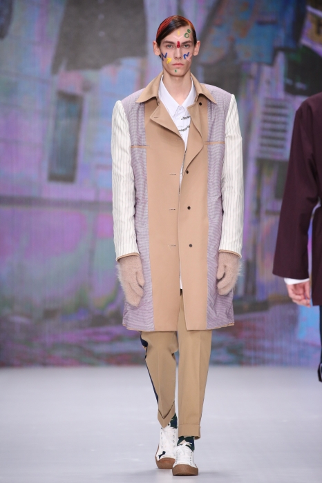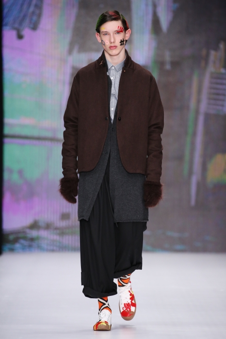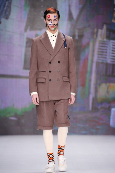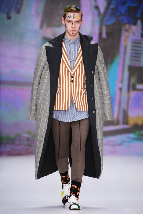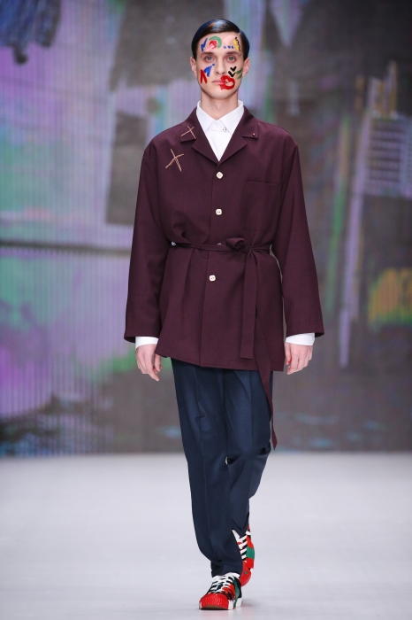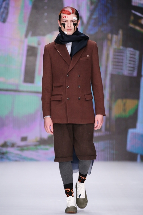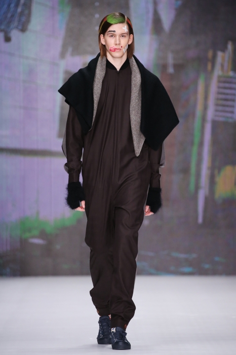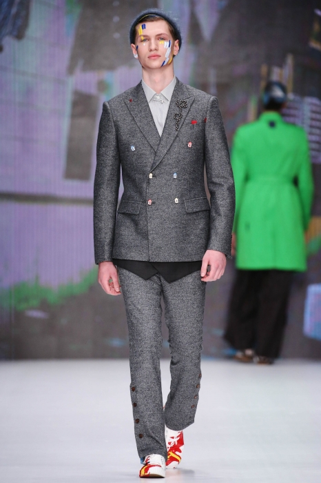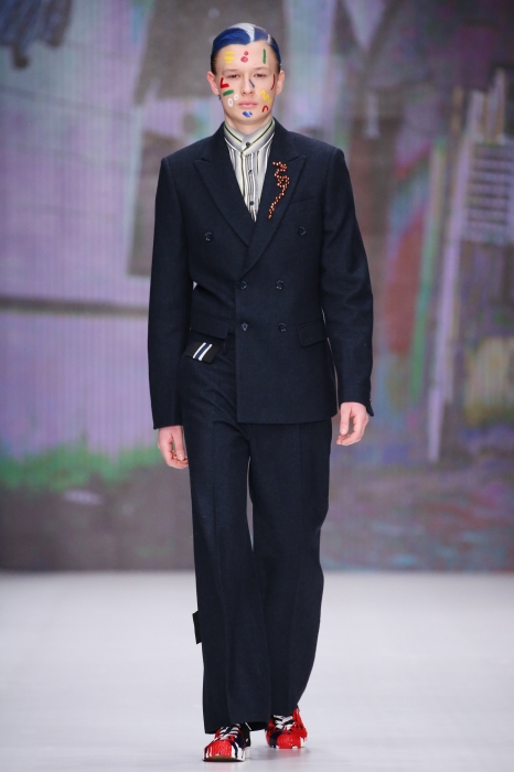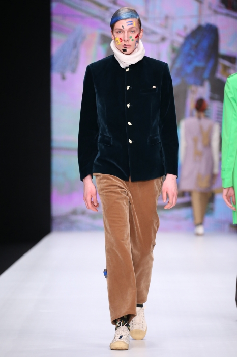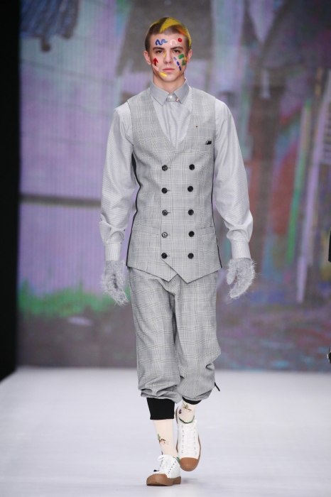 За основу коллекции взят традиционный мужской костюм, который Артем дополняет спортивными элементами (кальсонами со шнуровкой и беговыми кроссовками), играет с пропорциями (укорачивает пиджаки и режет брюки со стрелками) и раскрашивает во все цвета радуги (от «кирпичного» до оттенка киношного хромакея). В результате получается футуристичная одежда, которую может без стеснения (физического и душевного) позволить себе любой мужчина. А вот на комбинезоны, пушистые митенки, шарф с пэчворком и носки с креветками нужно еще решиться.