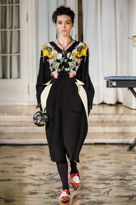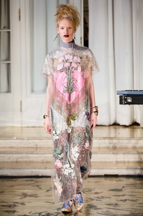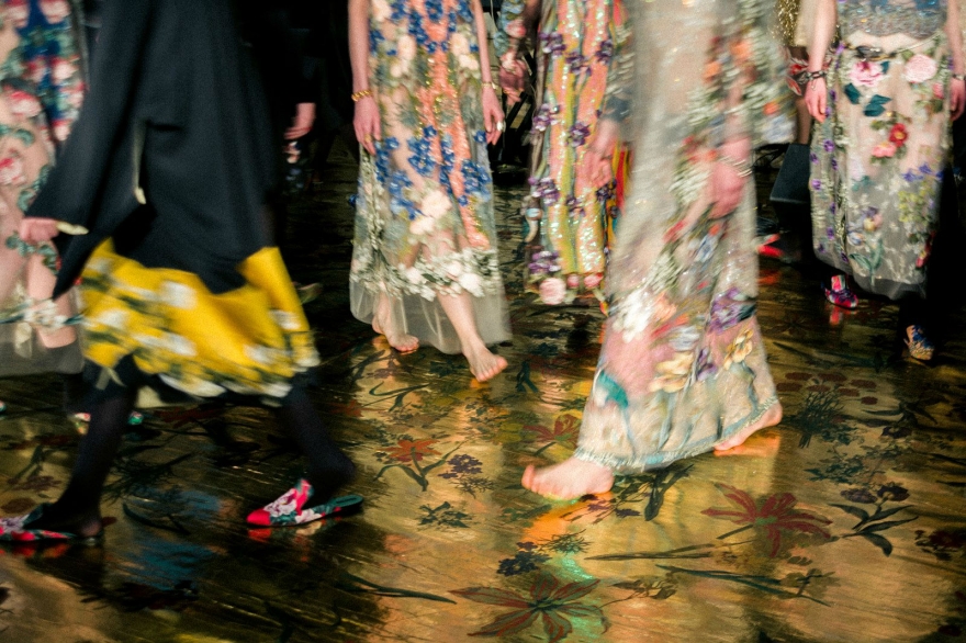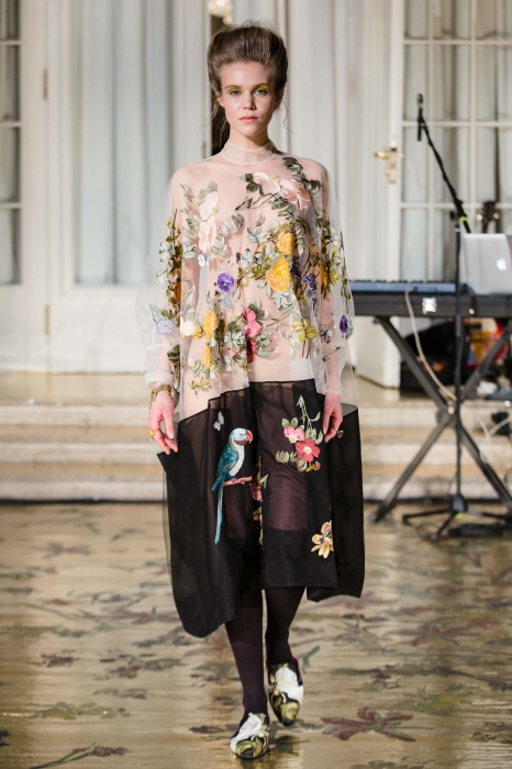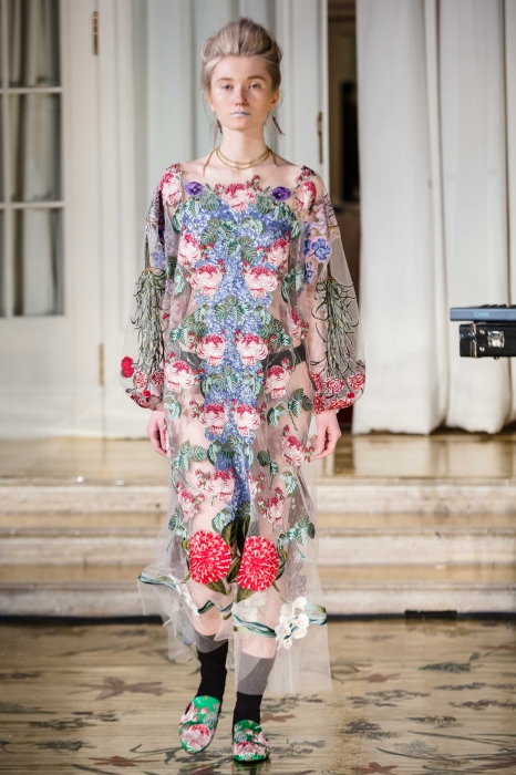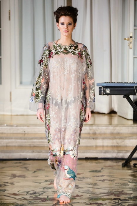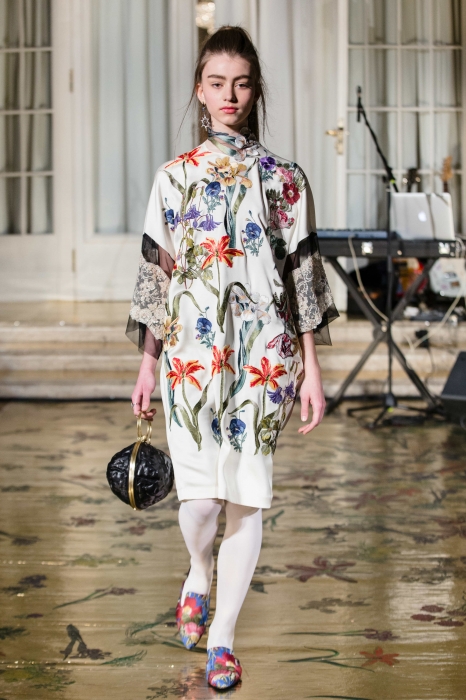 Каждый из 21 наряда был расшит шелковыми нитями, аккуратными пайетками и мотивами флоры и фауны — помимо бутонов, на платьях возникли бабочки, стрекозы и разноцветные попугаи. Под ними и прозрачными эфирными тканями прятались однотонные комплекты белья и темные гольфы, а стилизовали эти ансамбли сумки-грецкие орехи, позолоченные браслеты и пояса из тонких стебельков.
